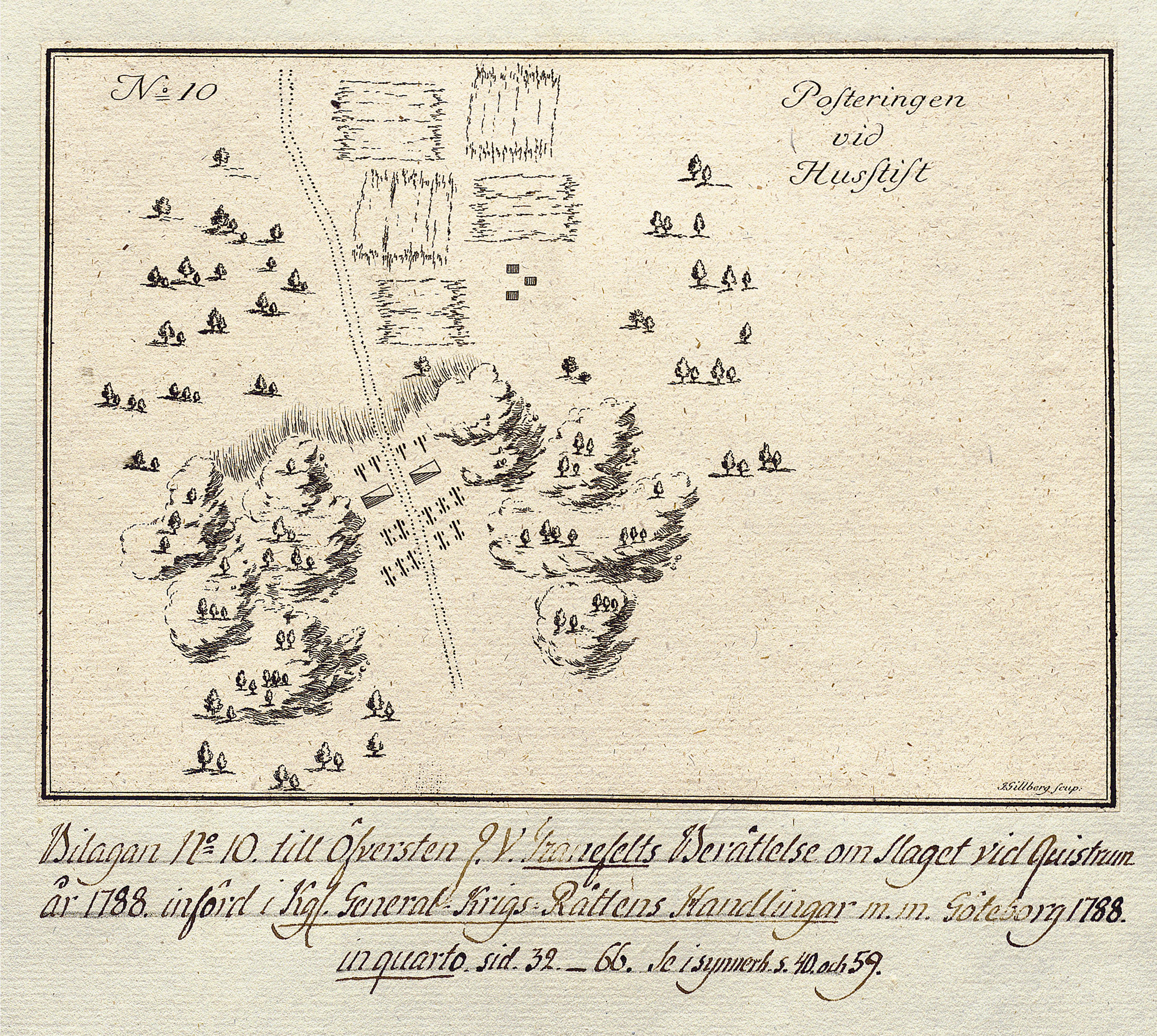 Beskrivning: Karta över slaget vid Kvistrum (idag Kviström) 1788. Ur: J.V. Tranefelt, Berättelse om Norska Arméns inbrott i Bohuslän och Slaget vid Quistrum år 1788. Göteborg 1788. Kopparstick av Jacob Gillberg.