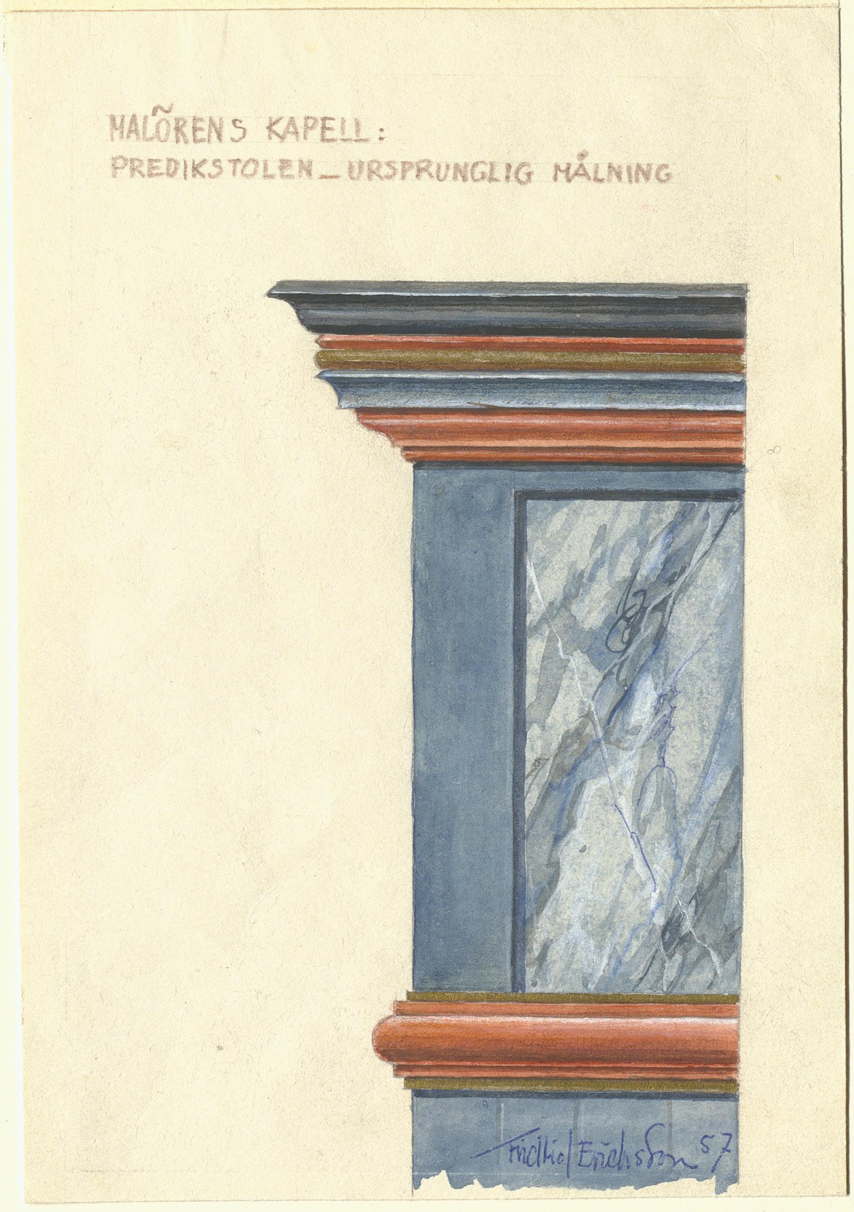 Beskrivning: Ursprunglig färgsättning på predikstolen. Akvarell av konservator Fridtiof Erichsson 1957, i samband med restatureringsarbete.