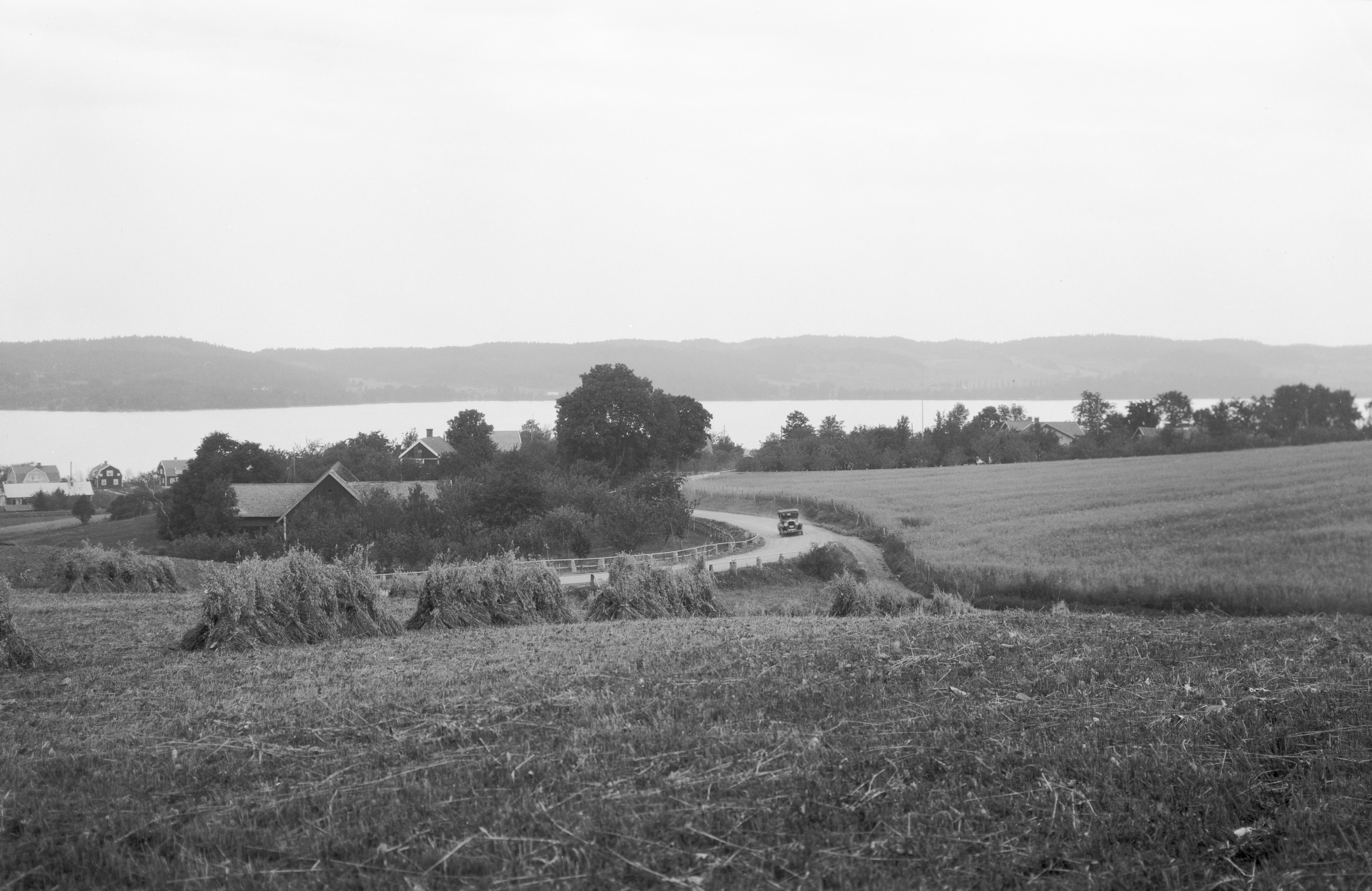 Beskrivning: Vy mot Landsjön. I förgrunden åker med hässjor. Fotot är möjligen från 1940-1945.