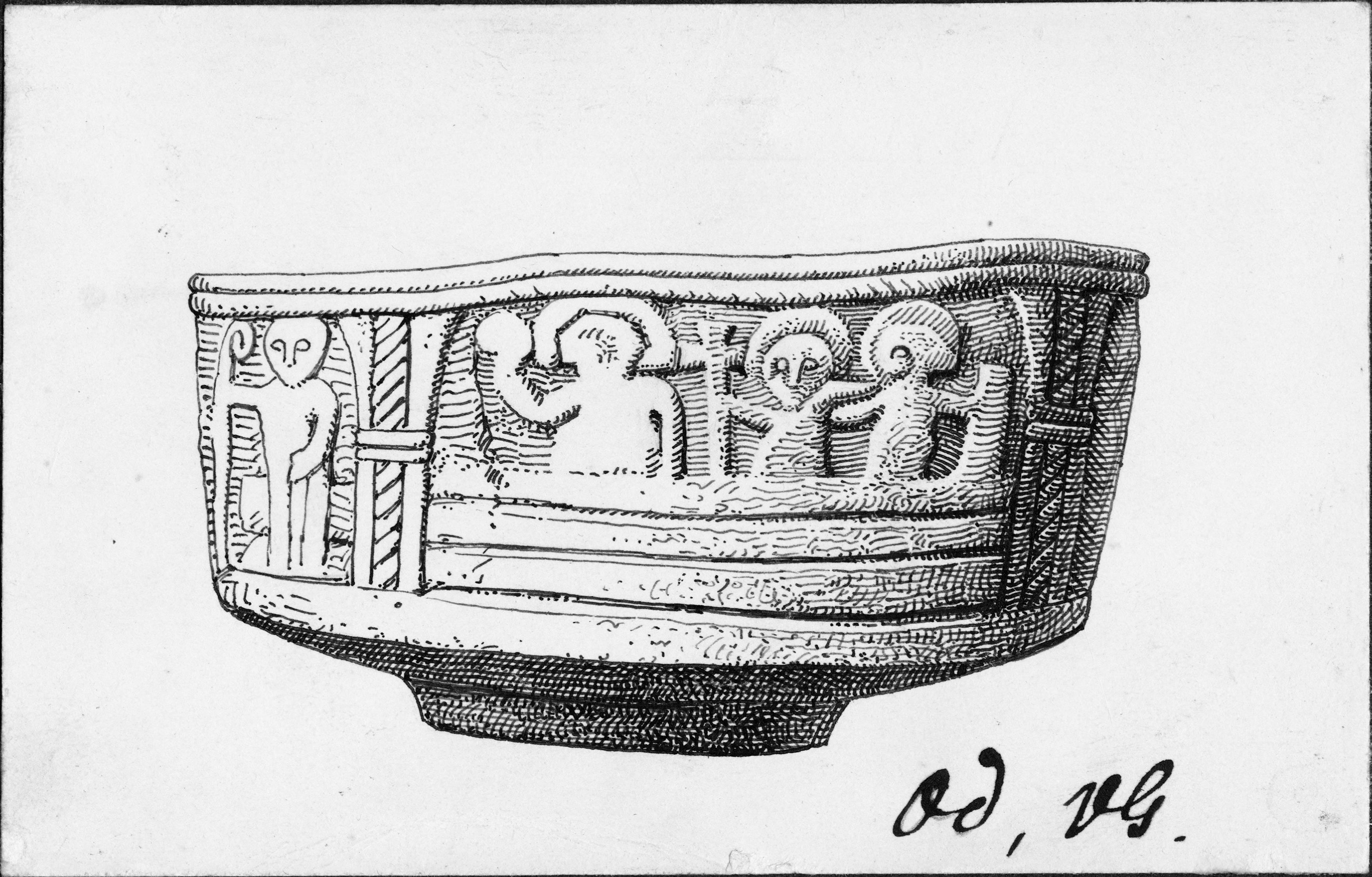 Beskrivning: Dopfunt, sandsten, 1200-talet? Tryck.