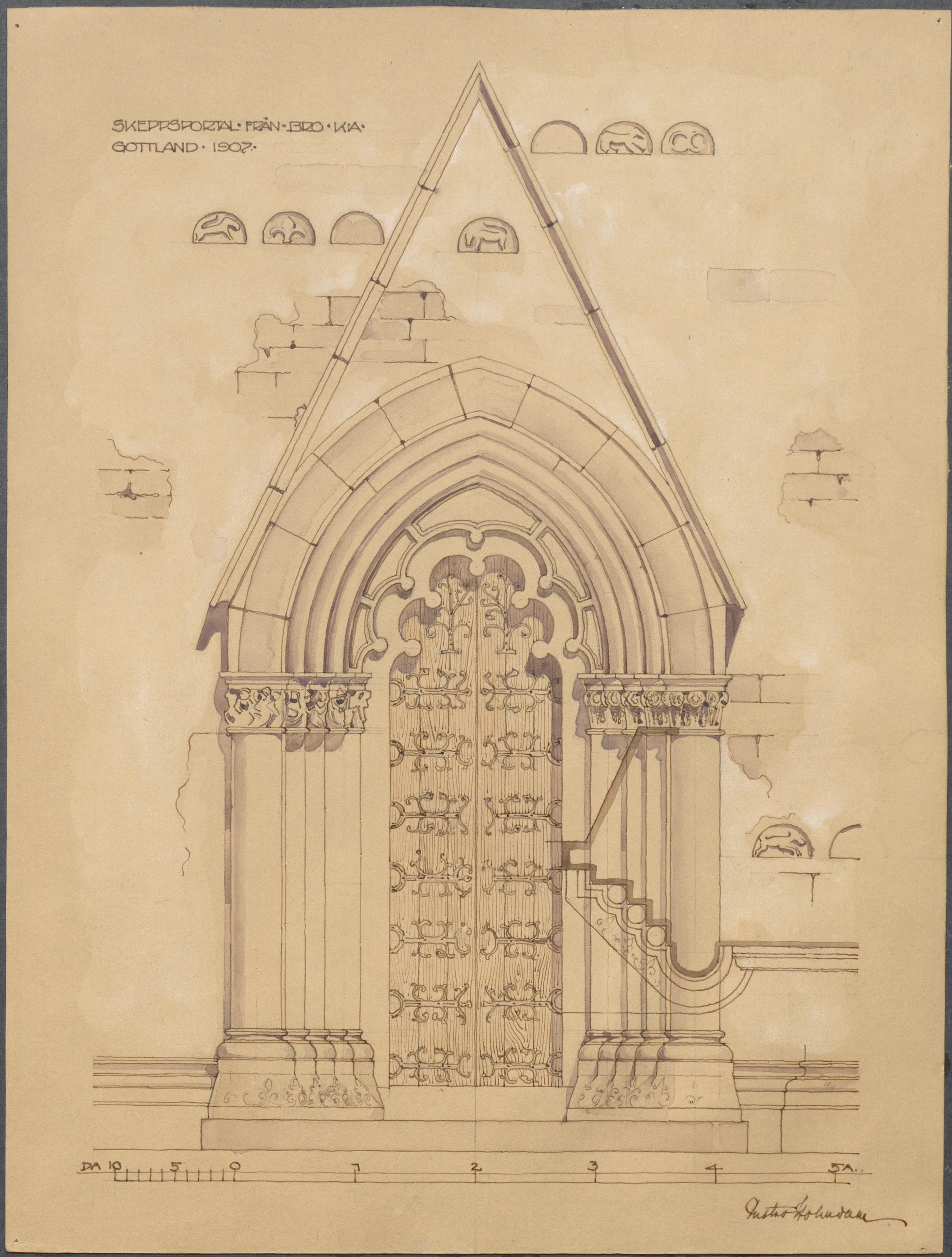 Beskrivning: Sydportalen. Akvarell av arkitekt Gustav Holmdahl, 1907.