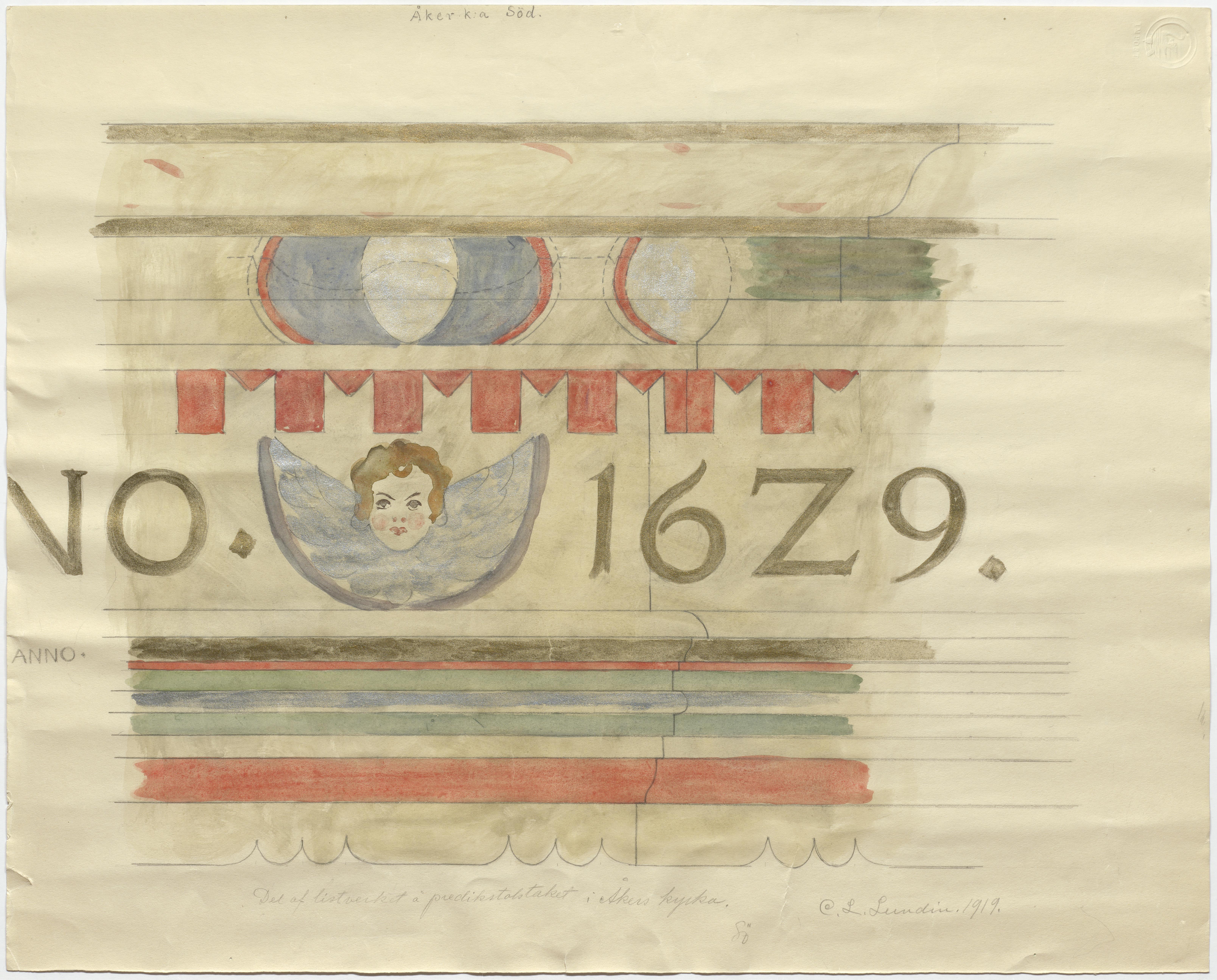 Beskrivning: Detalj av listverk på taket till predikstolen från 1629. Akvarell av Carl Leopold Lundin 1919.