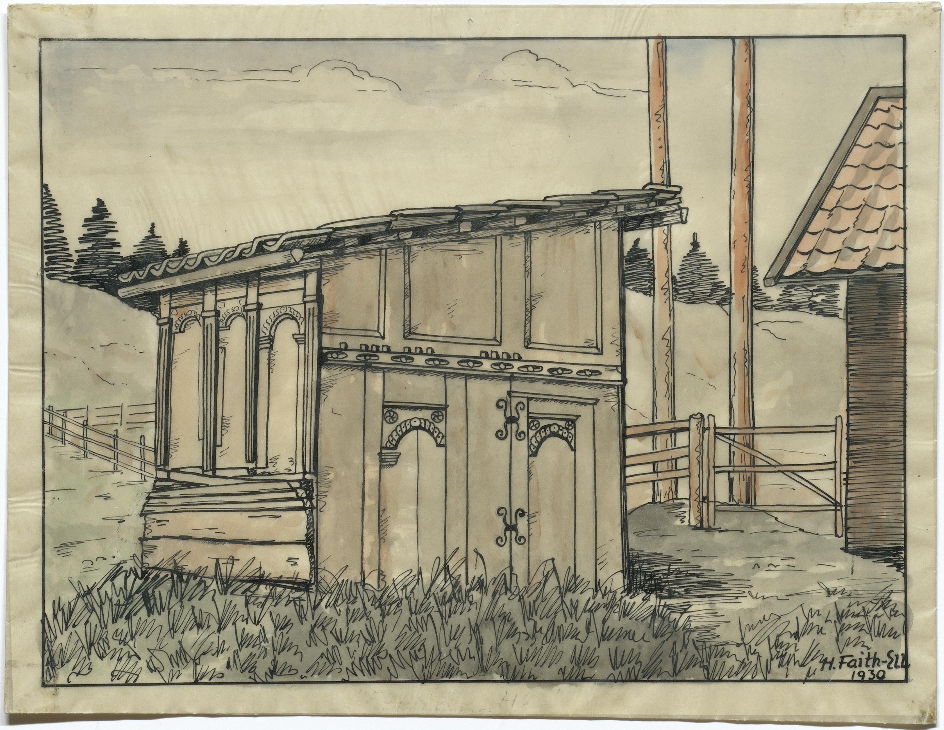 Beskrivning: Bänkdörrar och annan bänkinredning från ca 1650, del av ett uthus i Vidby, Älgviken, efter en auktion på 1870-talet. Nu förvarade i klockstapeln. Akvarell av Harald Faith-Ell 1930.
