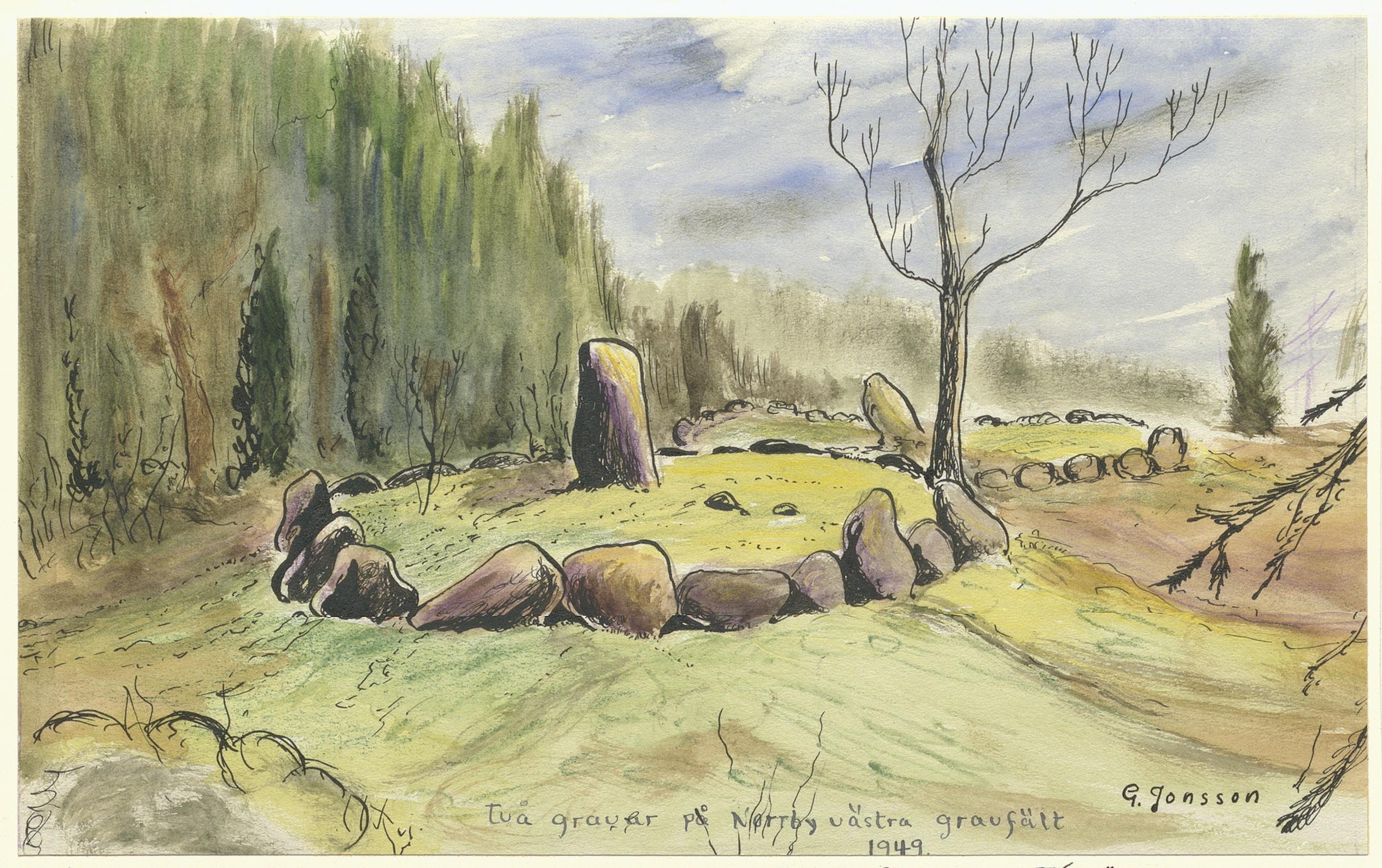 Beskrivning: Raä-nr: Valö 50:1. Gravfält. Akvarellerad tuschteckning av Georg Jonsson från 1949.