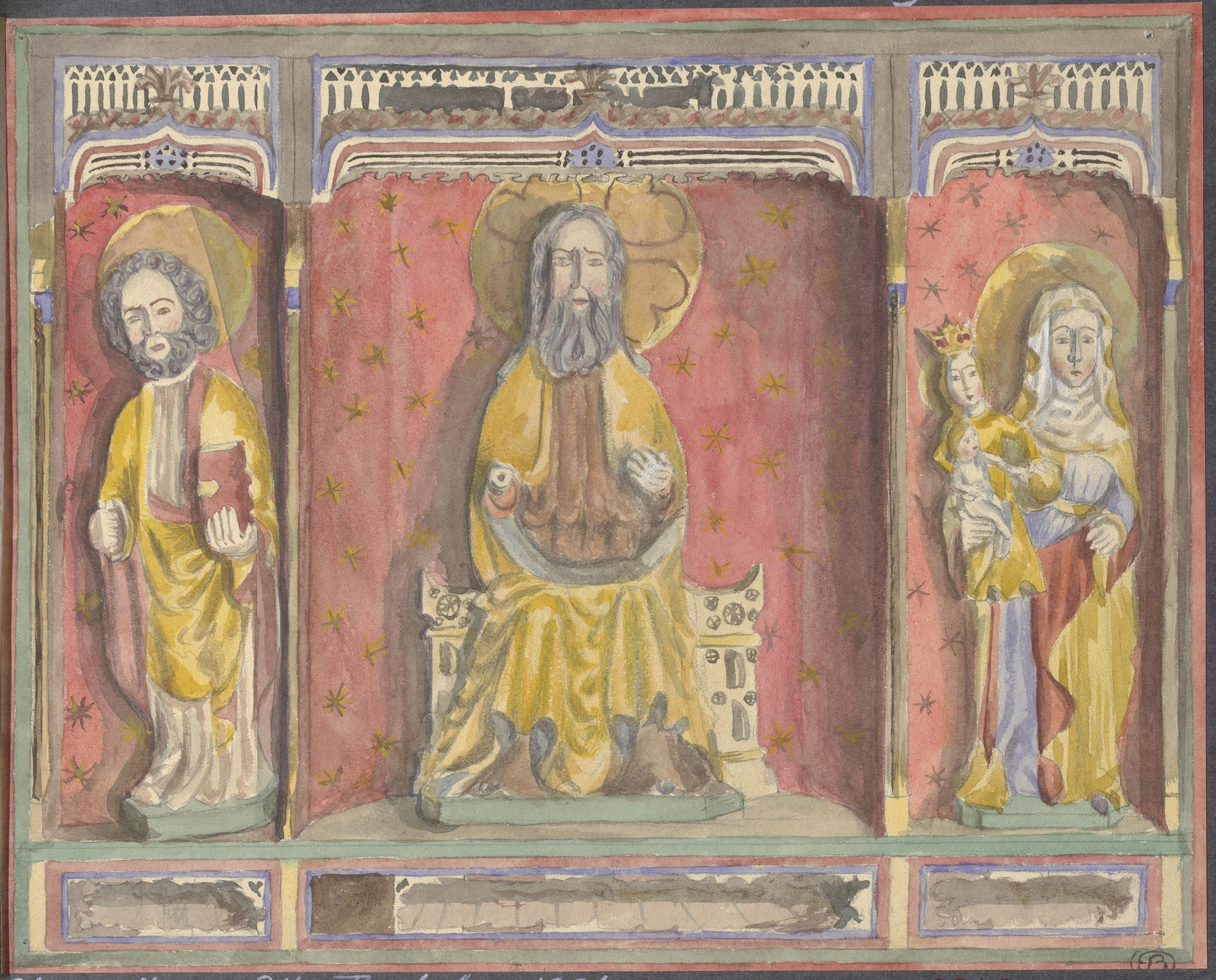 Beskrivning: Mittpartiet av altarskåp från 1500-talets början. Apostel, Treenigheten och Anna själv tredje. Akvarell av Ella Byström 1904.