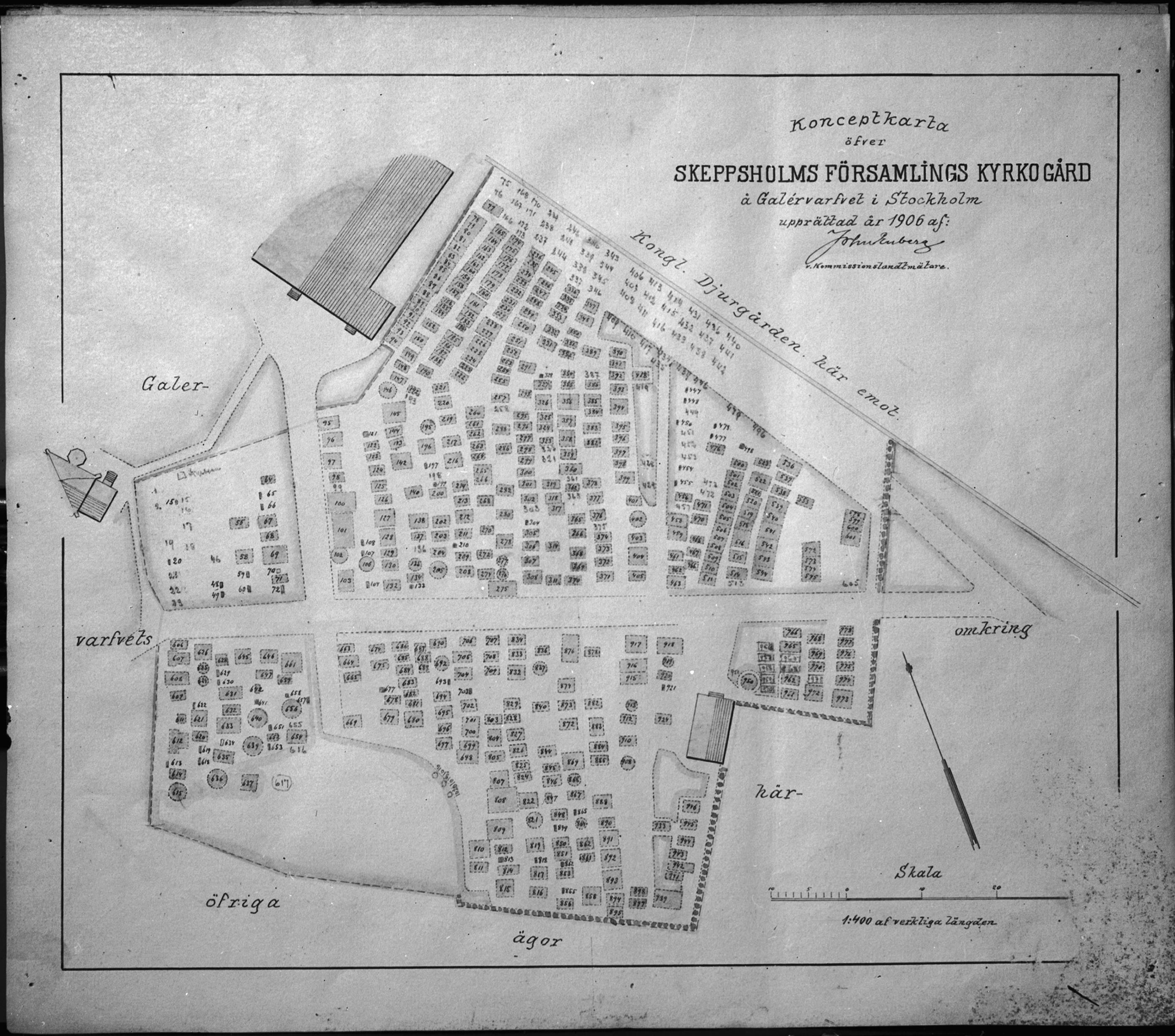 Beskrivning: Kyrkogården, situationsplan. Foto efter ritning av J. Enberg 1906.