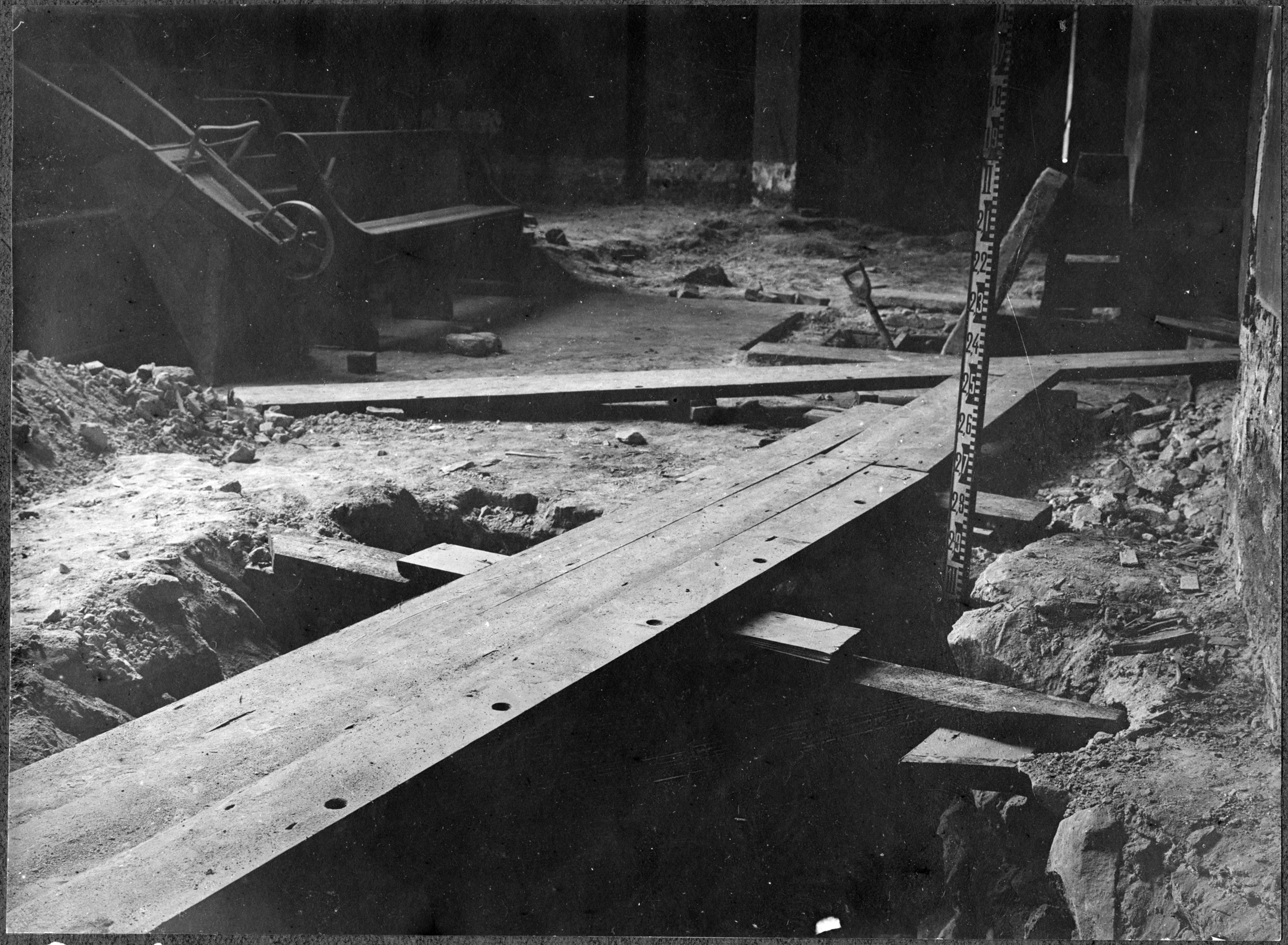 Beskrivning: Kyrkans renovering 1914. Omgången i sydöst från altaret mot södra ingången. Måttstaven stöder mot murad grav. Längre bort två gravar med hällar, en häll upplyft och en spade nedstucken i graven.