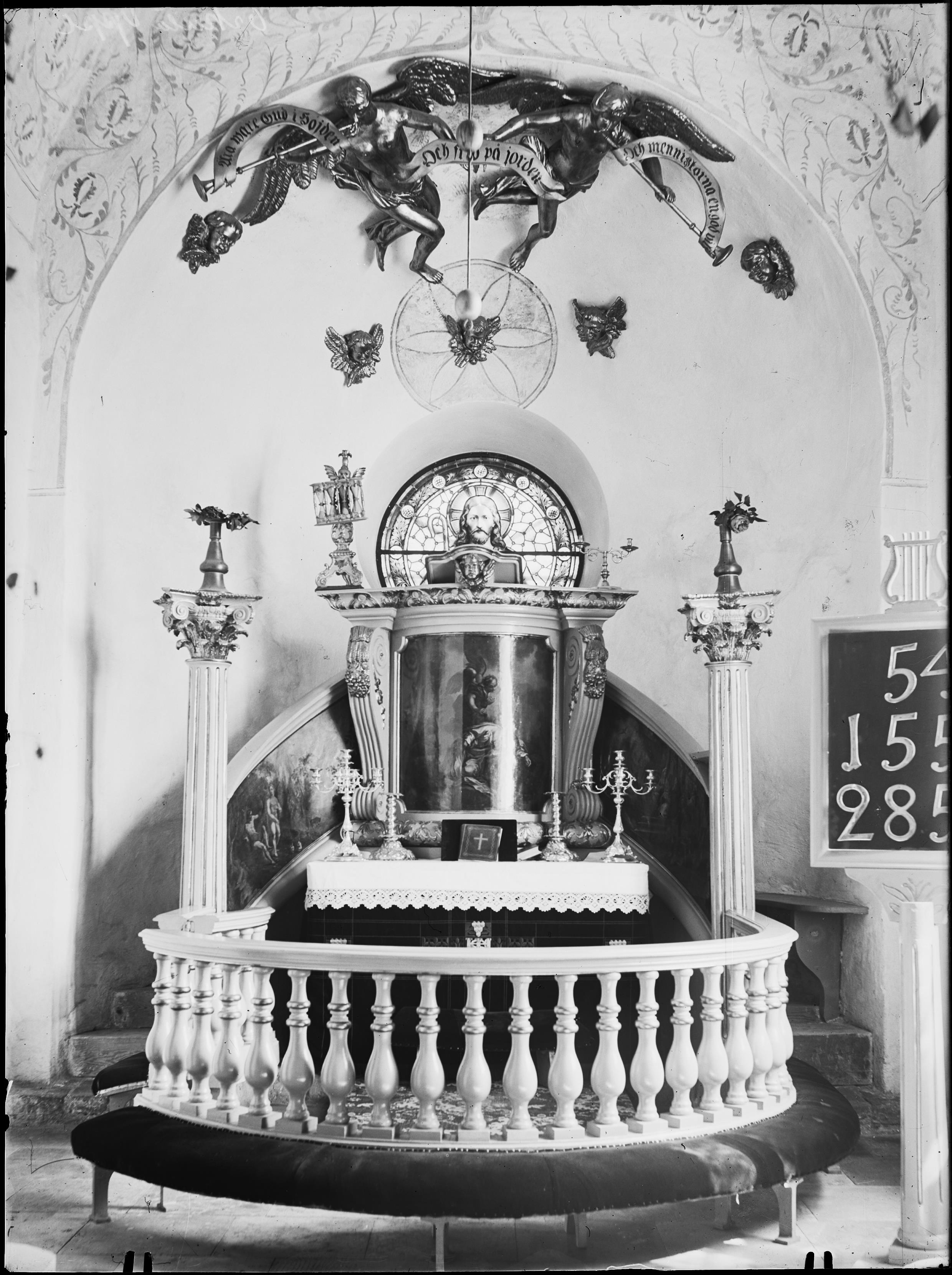 Beskrivning: Altarring, altare och altarpredikstol, mot öster. Takdekorationer i korabsiden. Glasfönster i fonden.