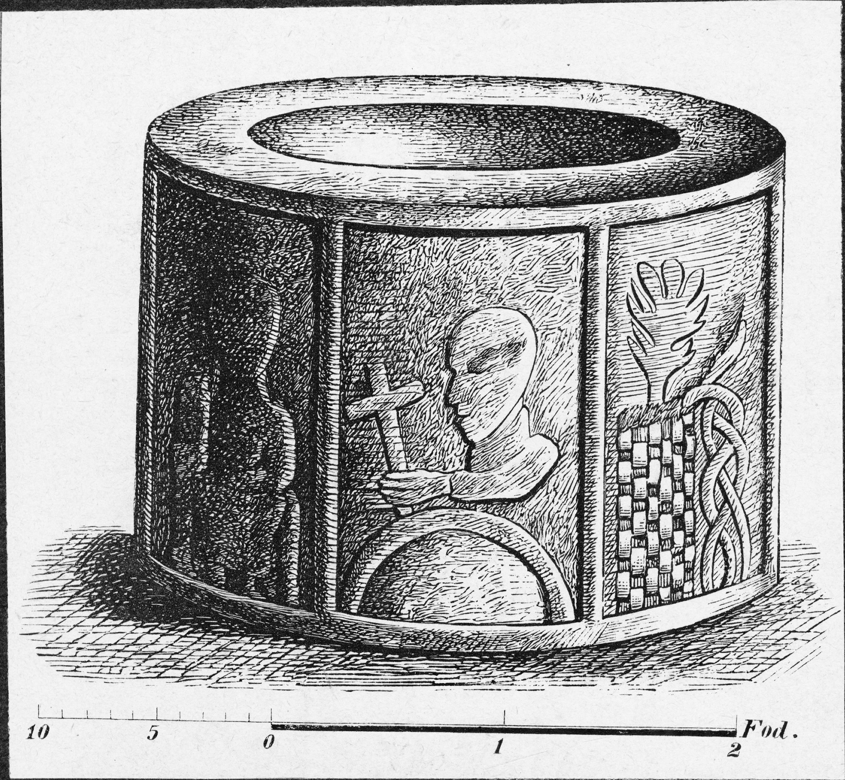 Beskrivning: Dopfunt, 1100-talet, cuppan. Tryck.