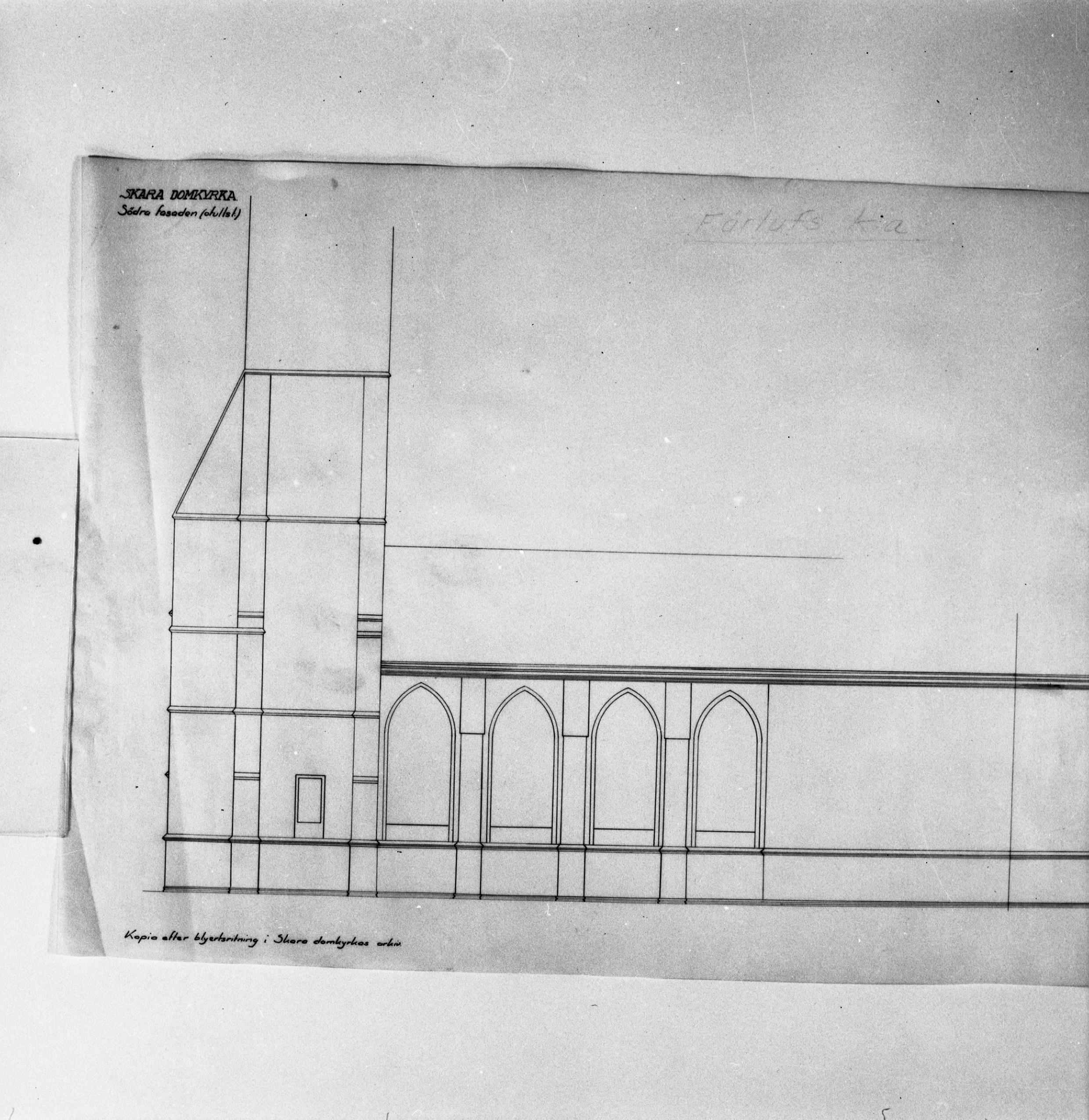 Beskrivning: Södra fasaden, västra delen. Foto efter ritning.