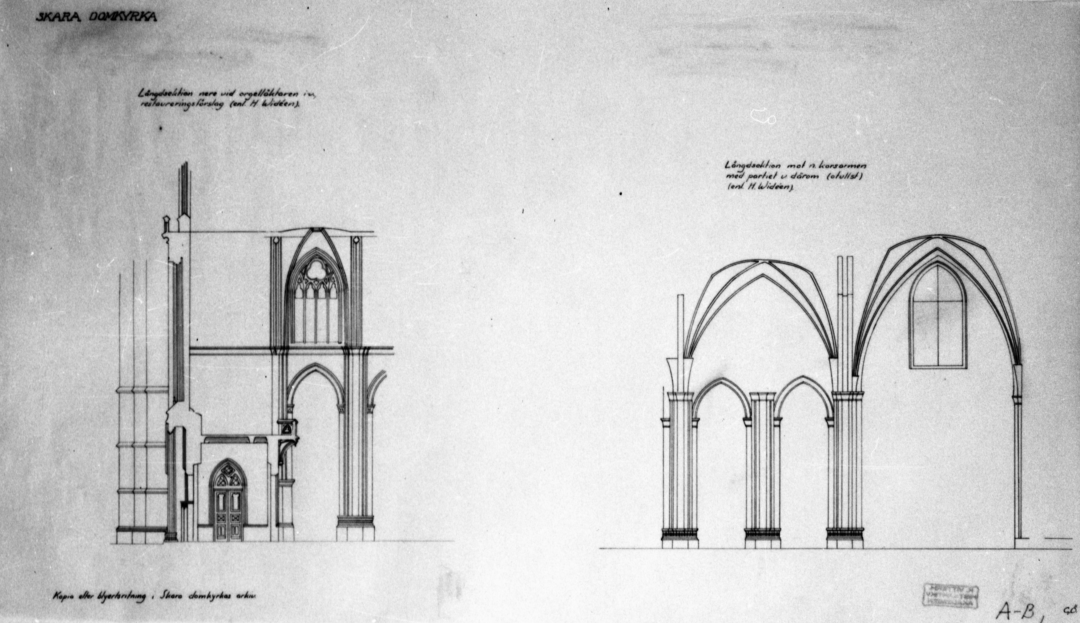 Beskrivning: Längdsektioner av orgelläktaren och norra korsarmen. Foto efter ritning.
