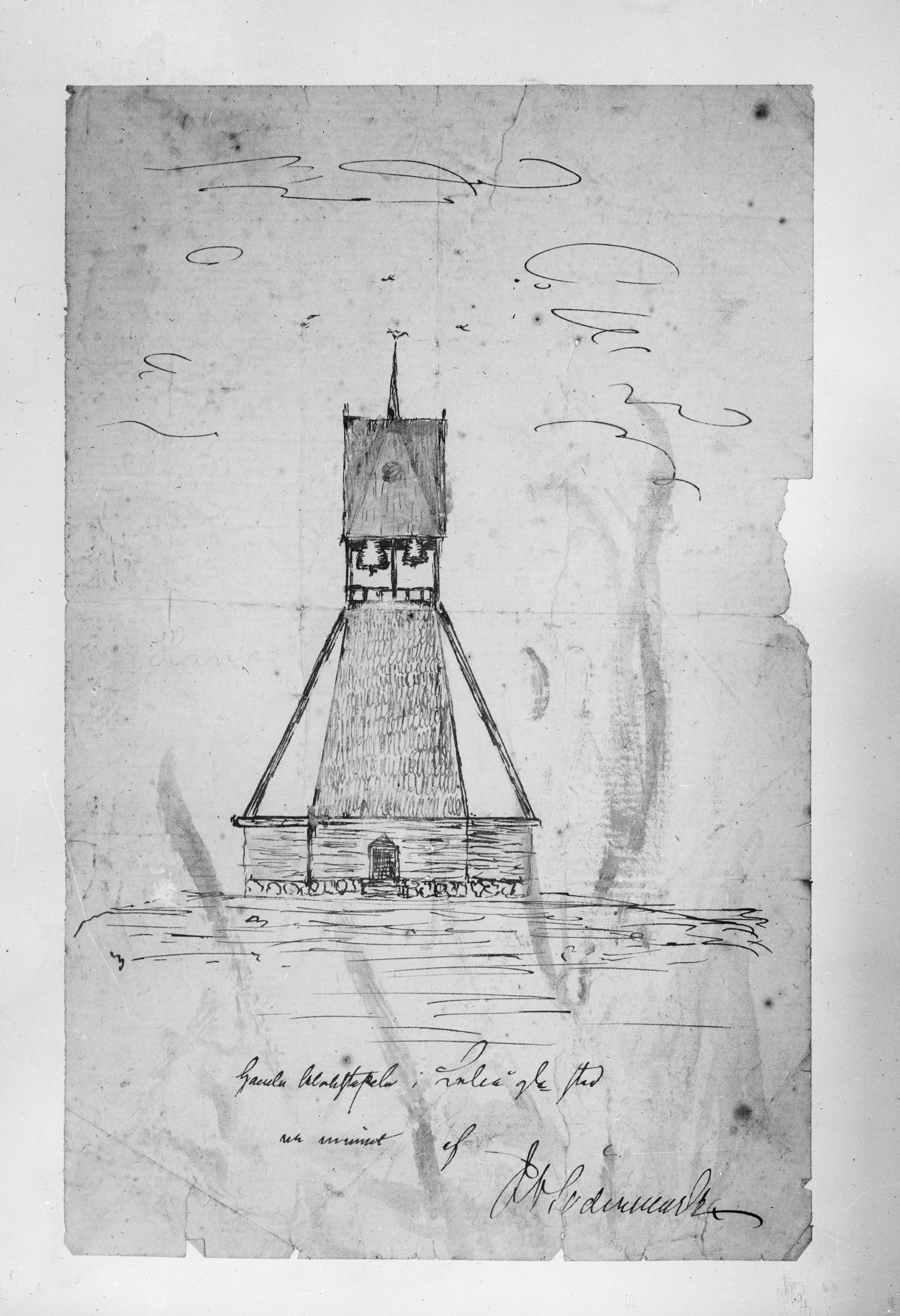 Beskrivning: Klockstapeln, äldre modell. Foto av teckning.