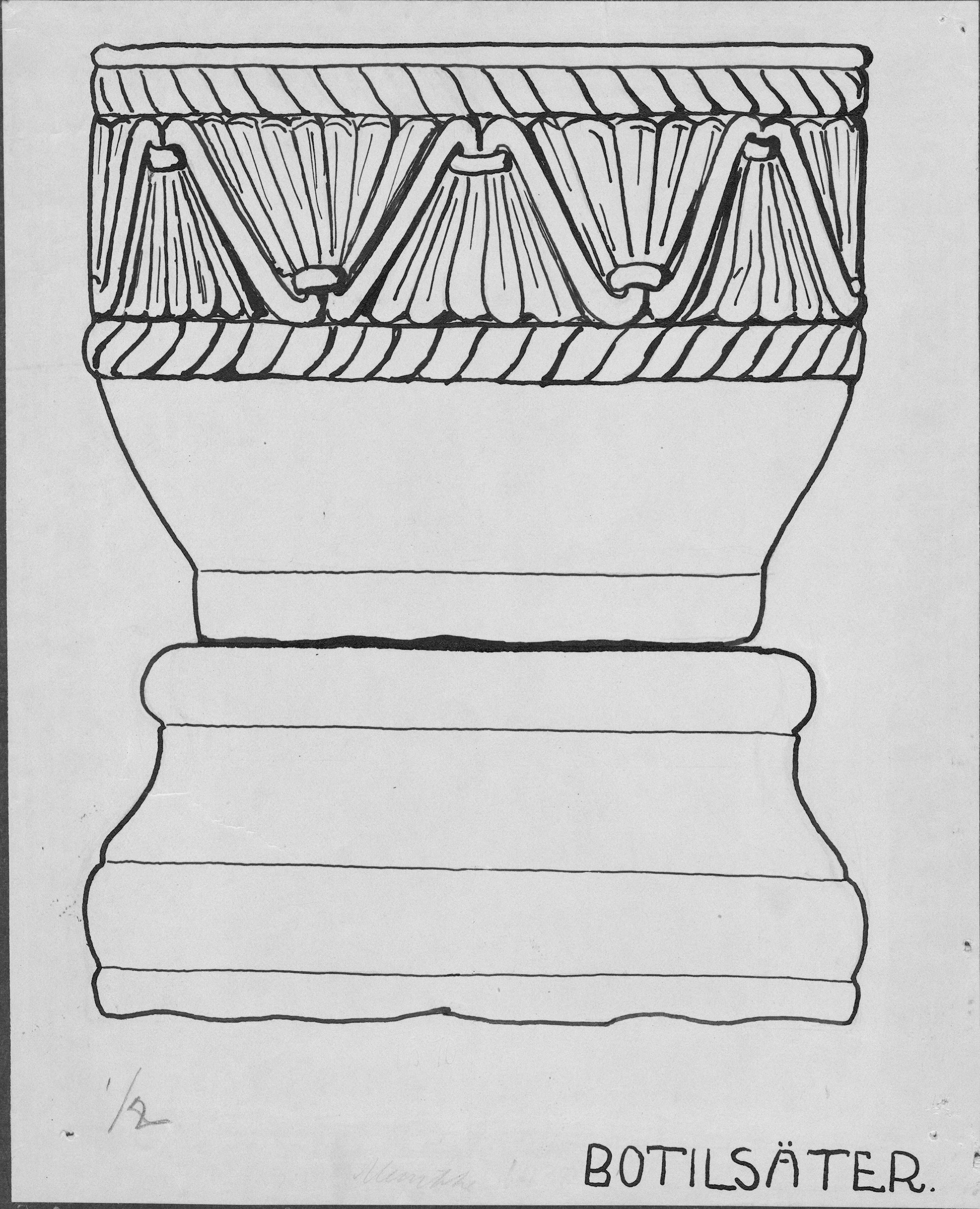 Beskrivning: Beskrivning: Dopfunt, medeltida. Teckning av Gustaf Munthe.
