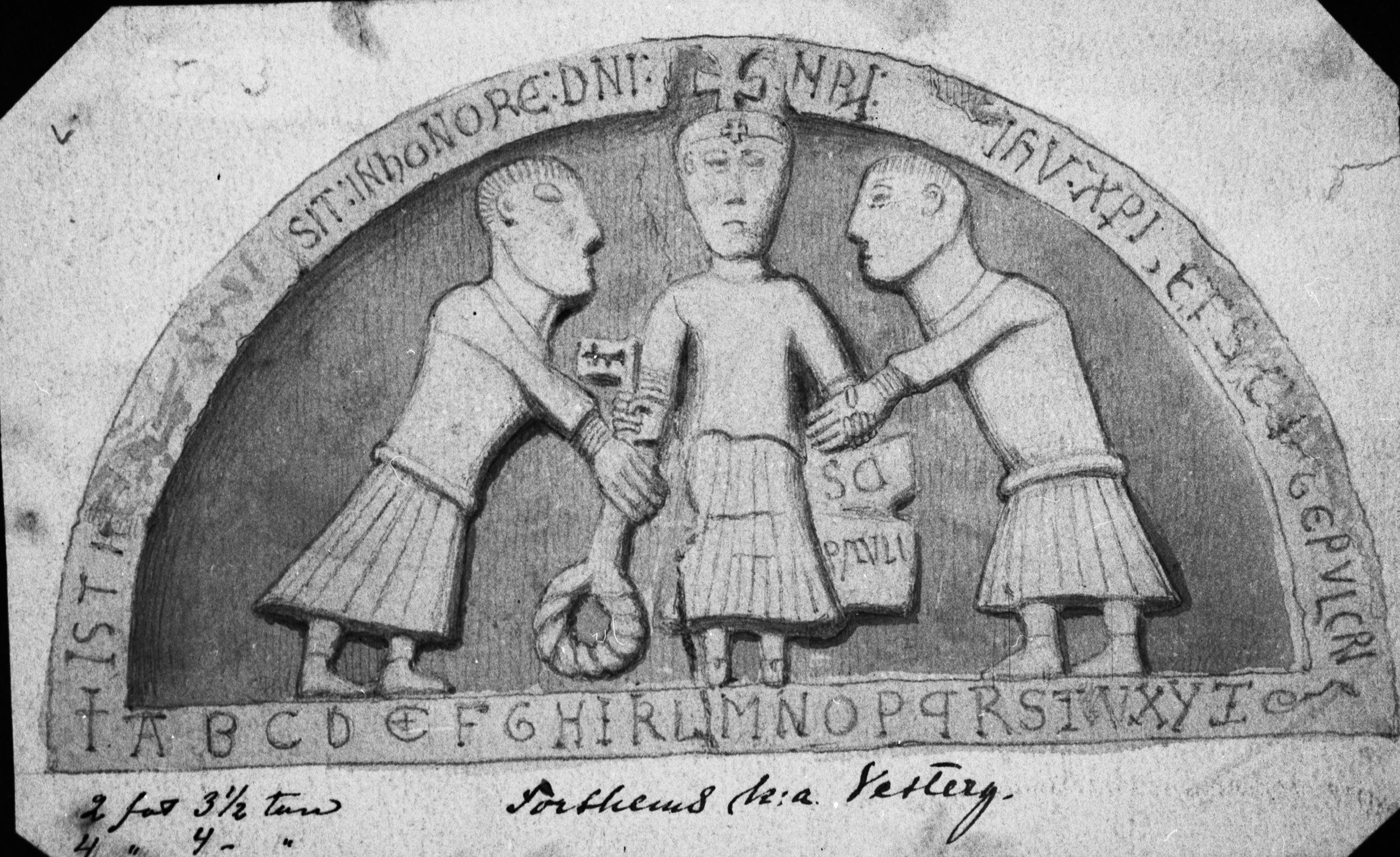 Beskrivning: Södra portalen, tympanonfältet. Foto efter laverad teckning.