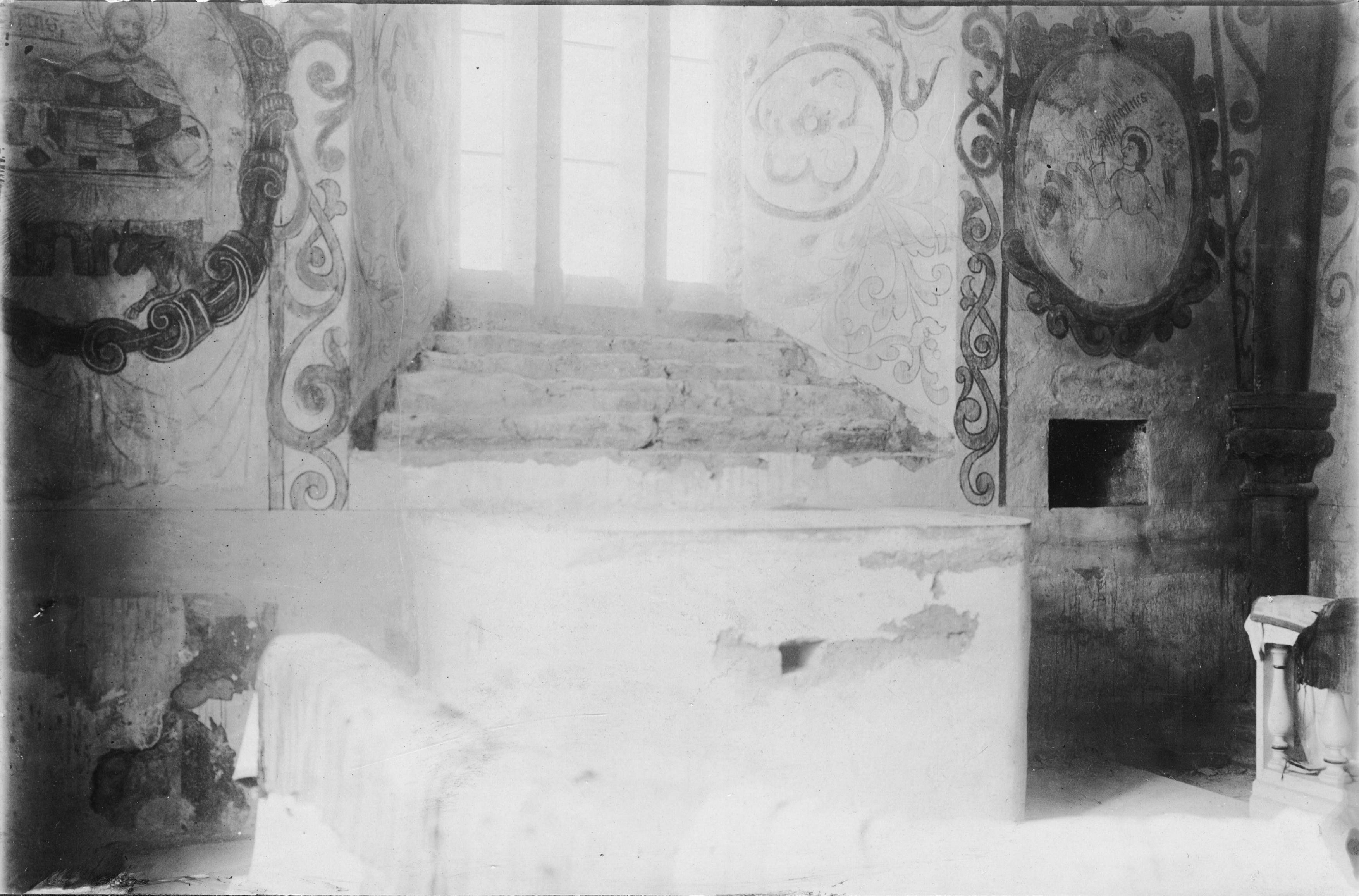 Beskrivning: Korets östra vägg, trappstegsformad fönsternisch, väggnisch, relikgömma i altaret. Under restaurering.
