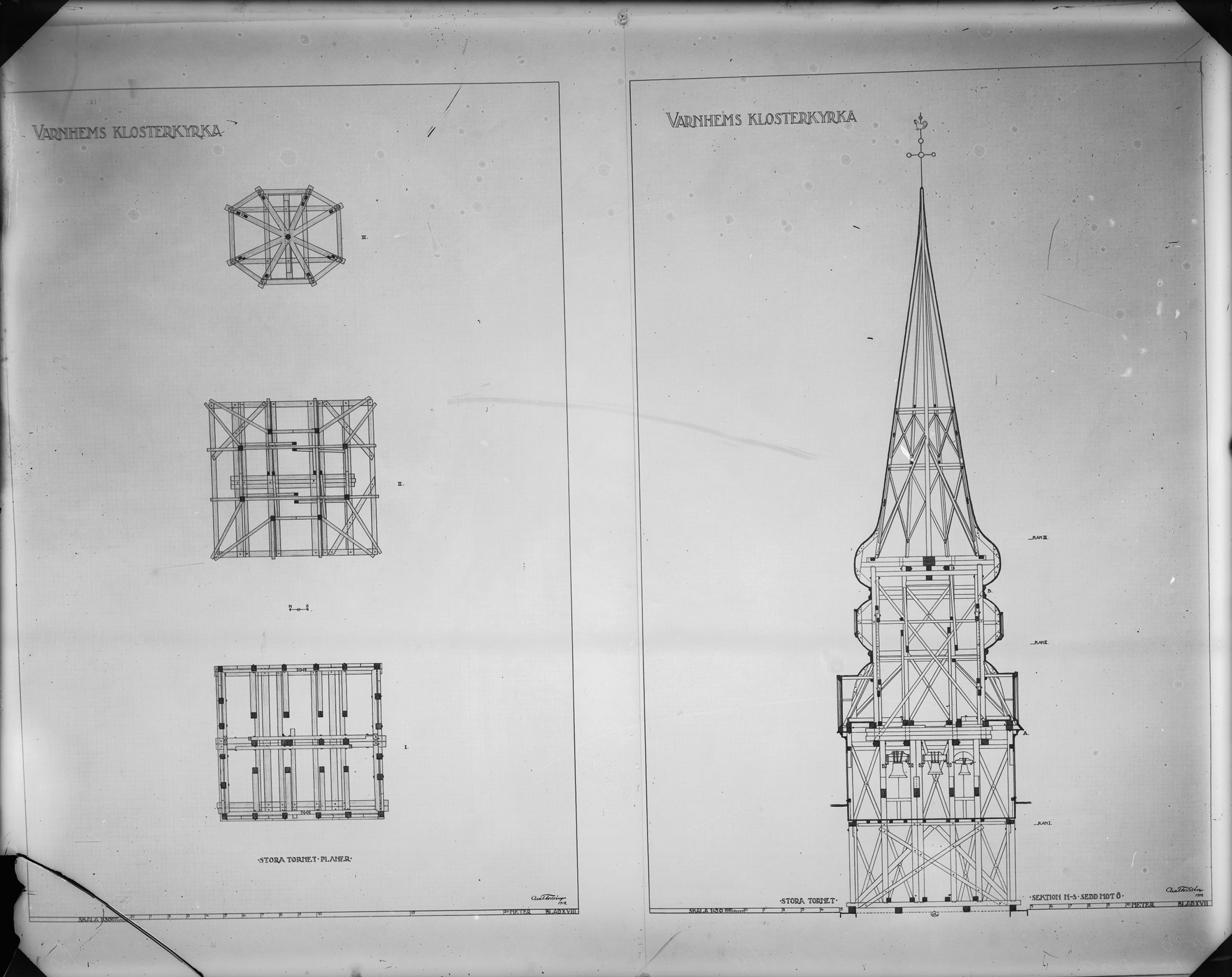 Beskrivning: Ritningar av Axel Forssén, planer och sektion av stora tornet, avfotograferade.