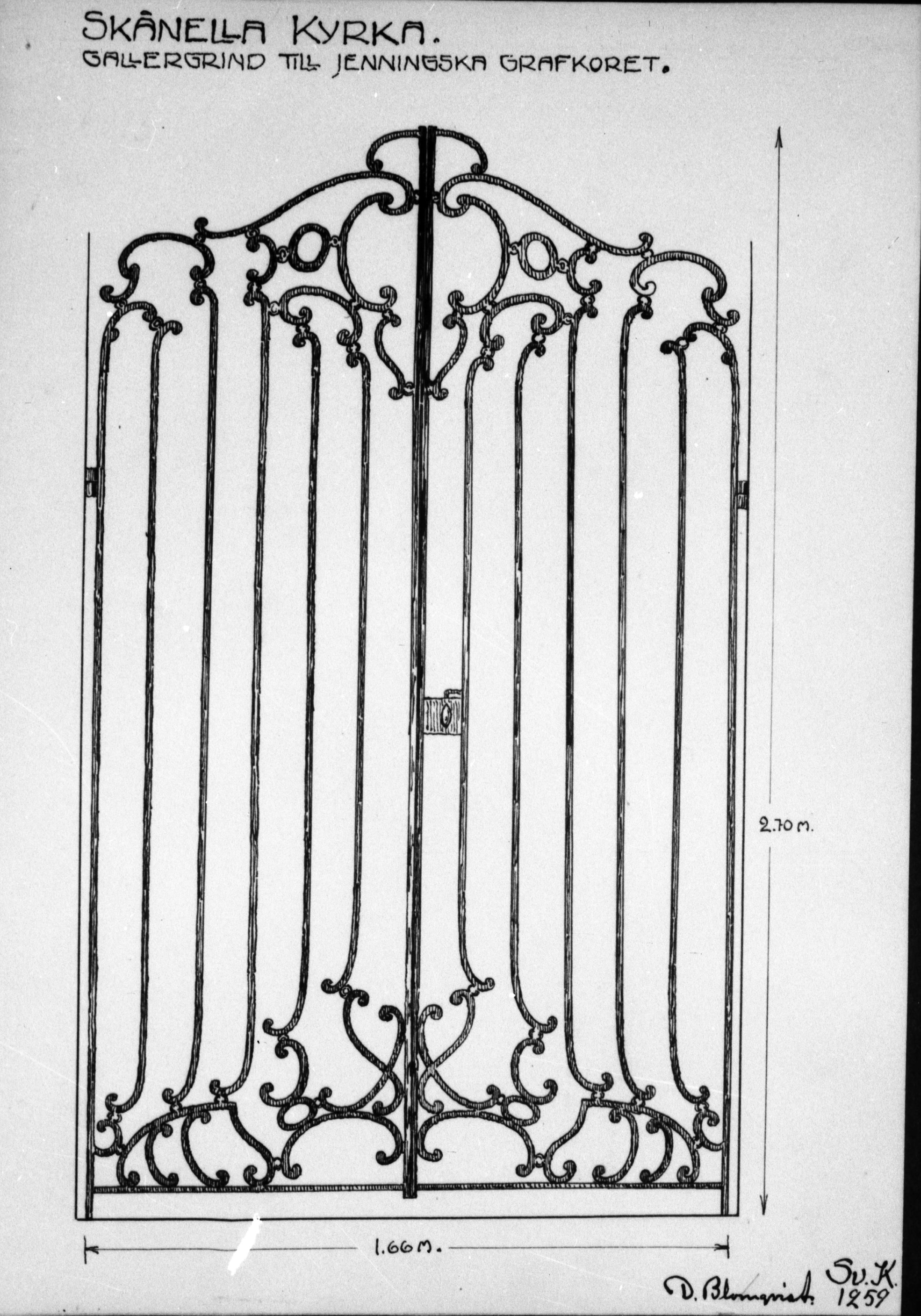 Beskrivning: Gallergrind av smitt järn till Jenningska gravkoret. Avfotograferad teckning, av David Blomqvist 1912.