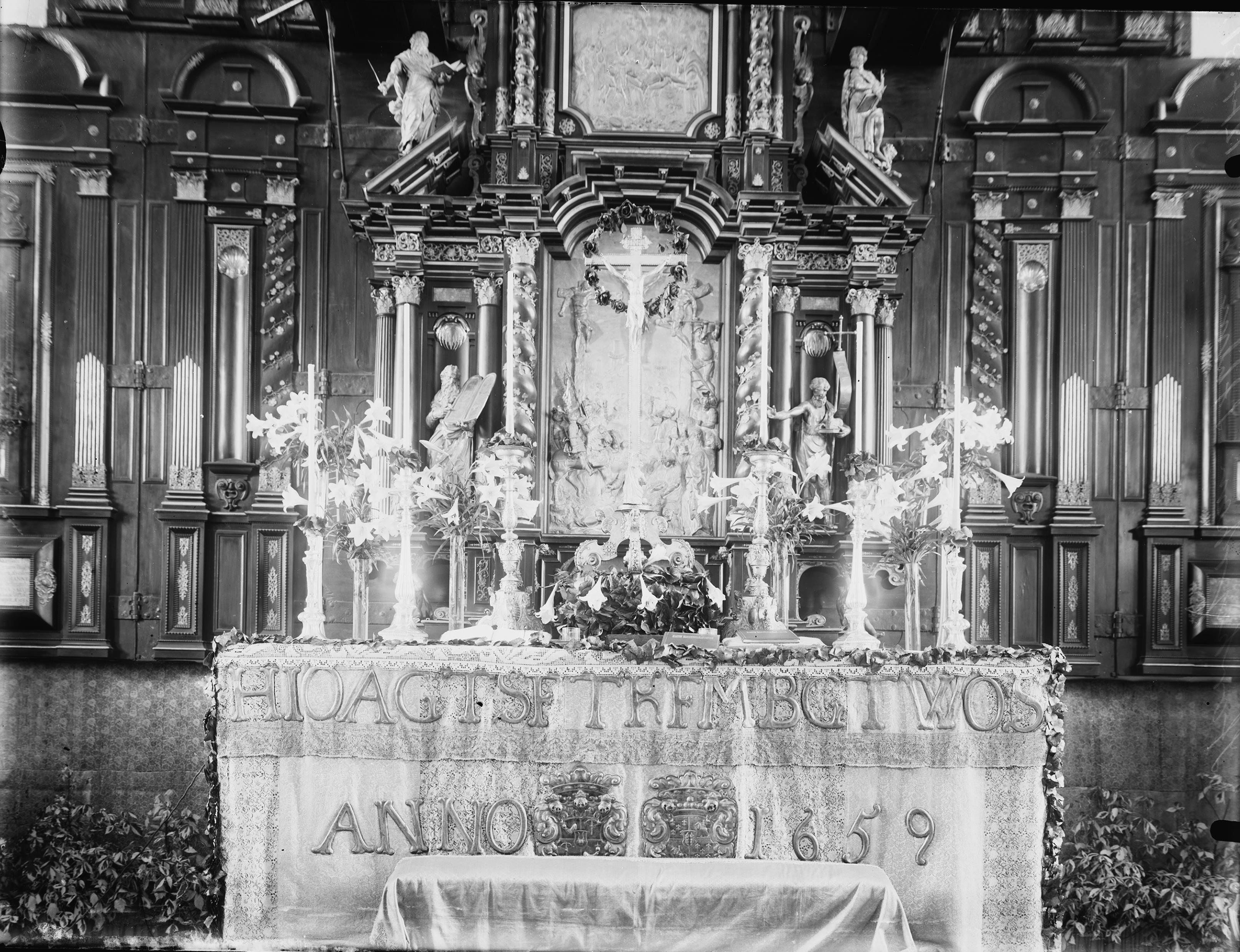 Beskrivning: Retabel, "Silveraltaret", ursprungligen skänkt 1652-54, nedre partiet, altaret.