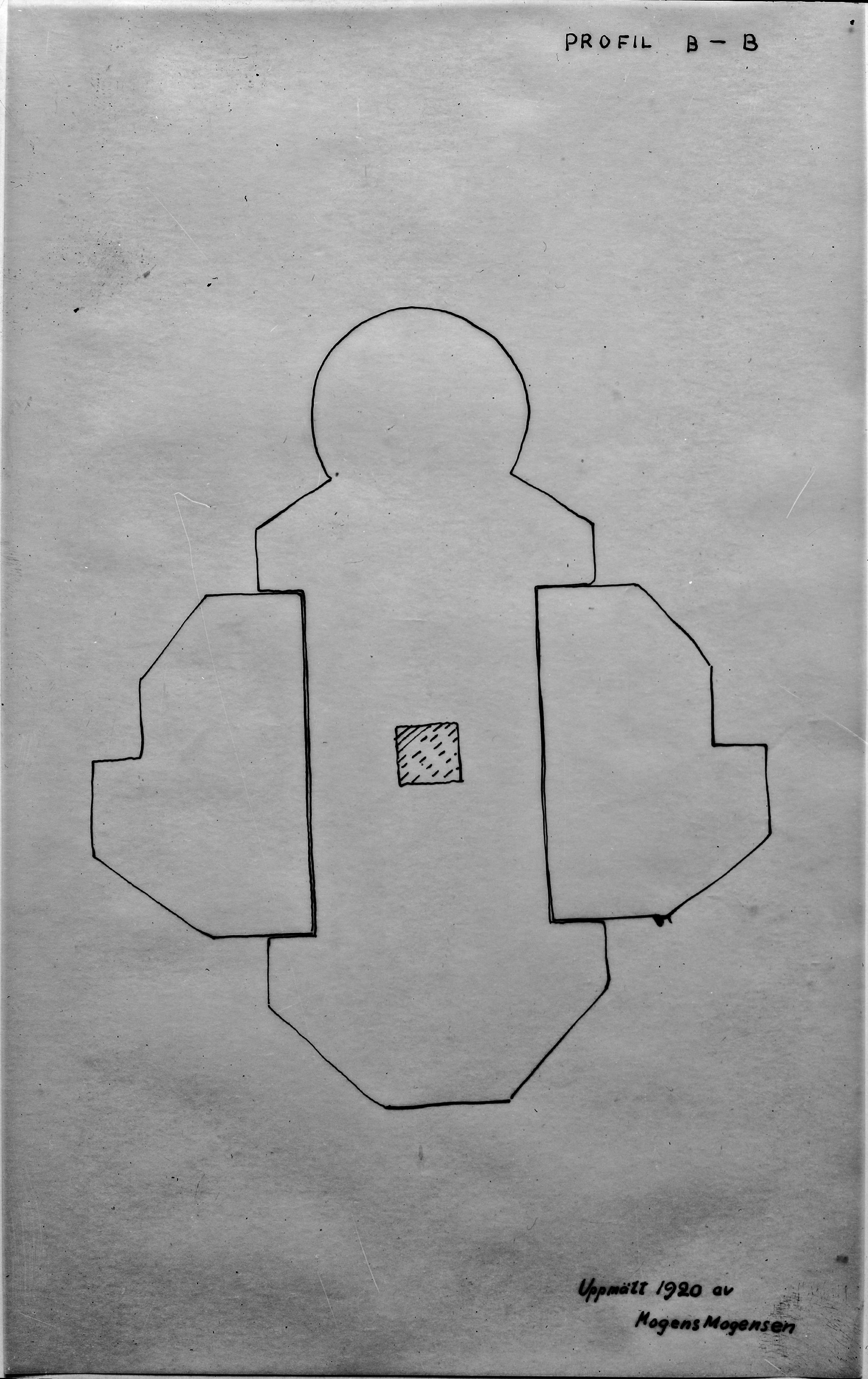 Beskrivning: Norra tvärskeppets rosettfönster, uppmätningsprofil, 1920, av Mogens Mogensen. Avfotograferad.