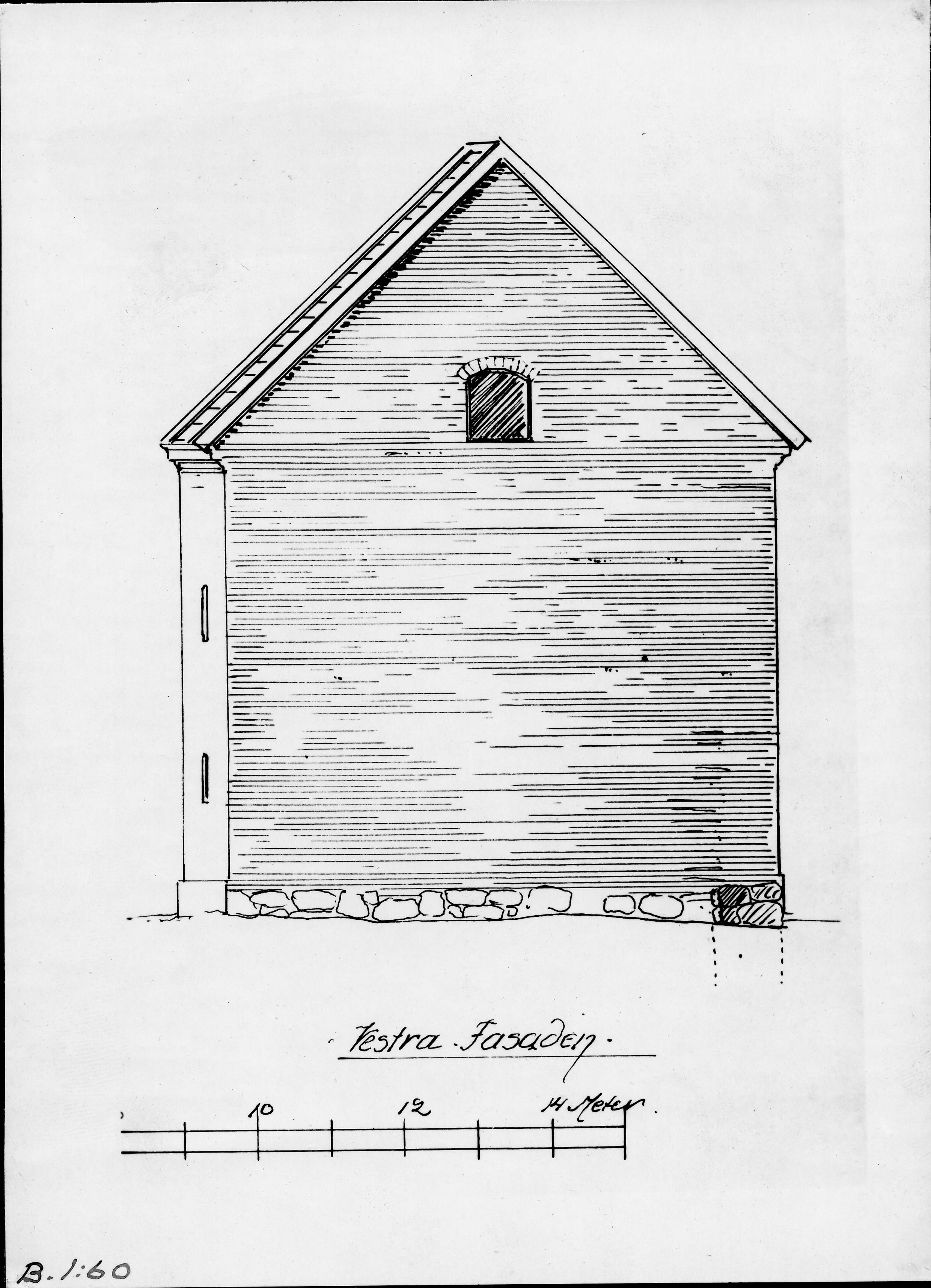 Beskrivning: Medeltida stenhuset (tiondeboden), västra fasaden. Uppmätning av Sigurd Curman. Avfotograferad.