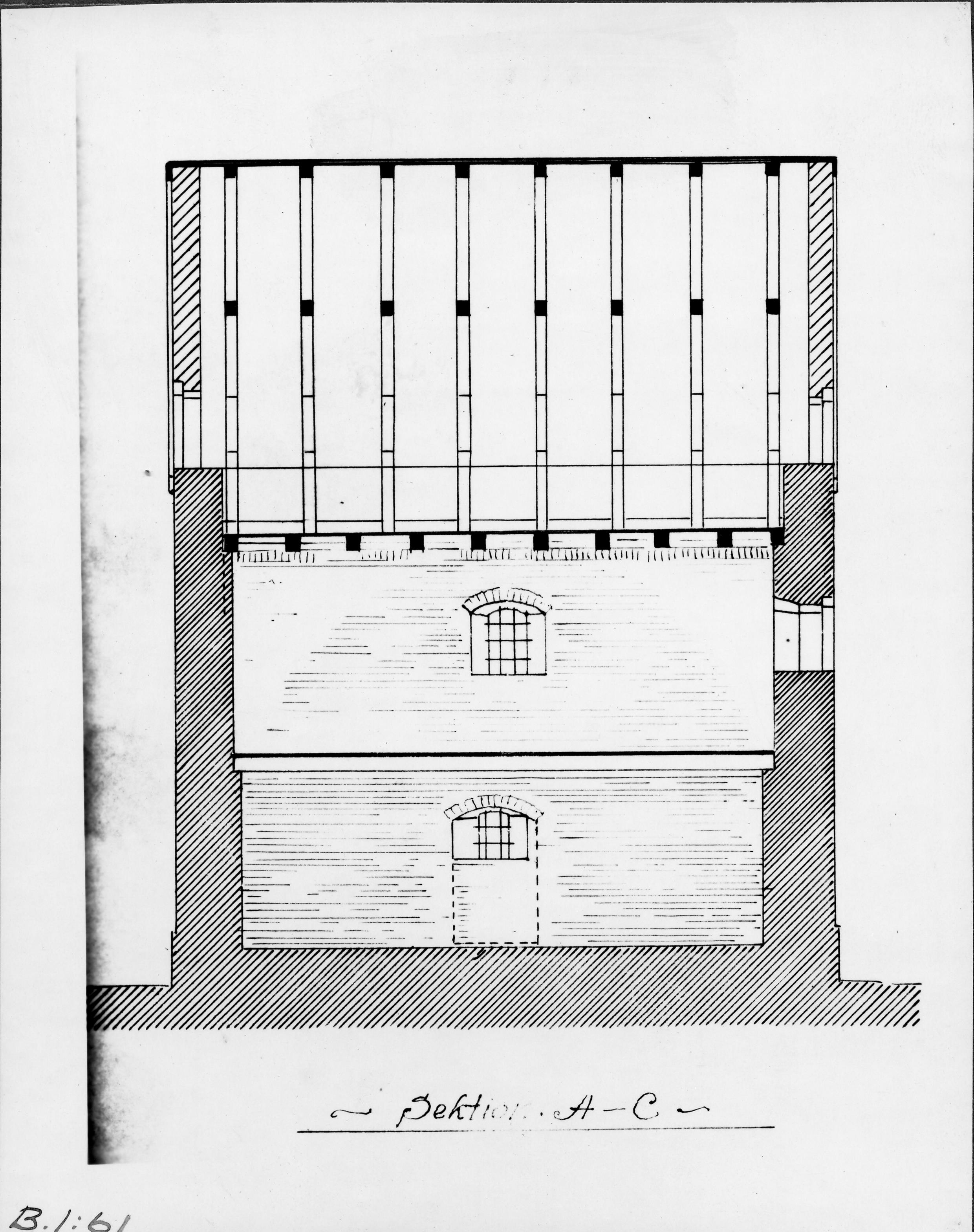 Beskrivning: Medeltida stenhuset (tiondeboden), sektion. Uppmätning av Sigurd Curman. Avfotograferad.
