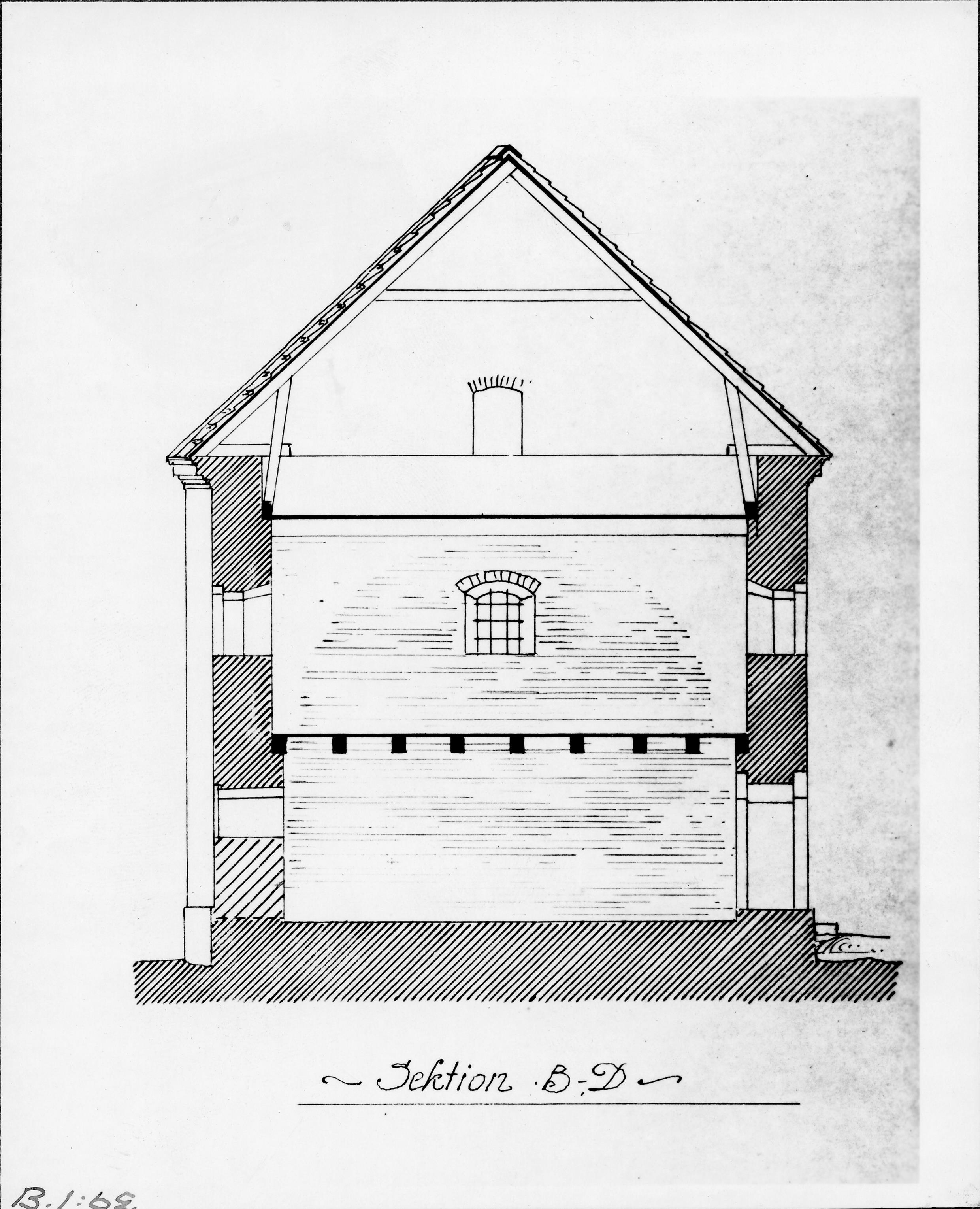 Beskrivning: Medeltida stenhuset (tiondeboden), sektion. Uppmätning av Sigurd Curman. Avfotograferad.