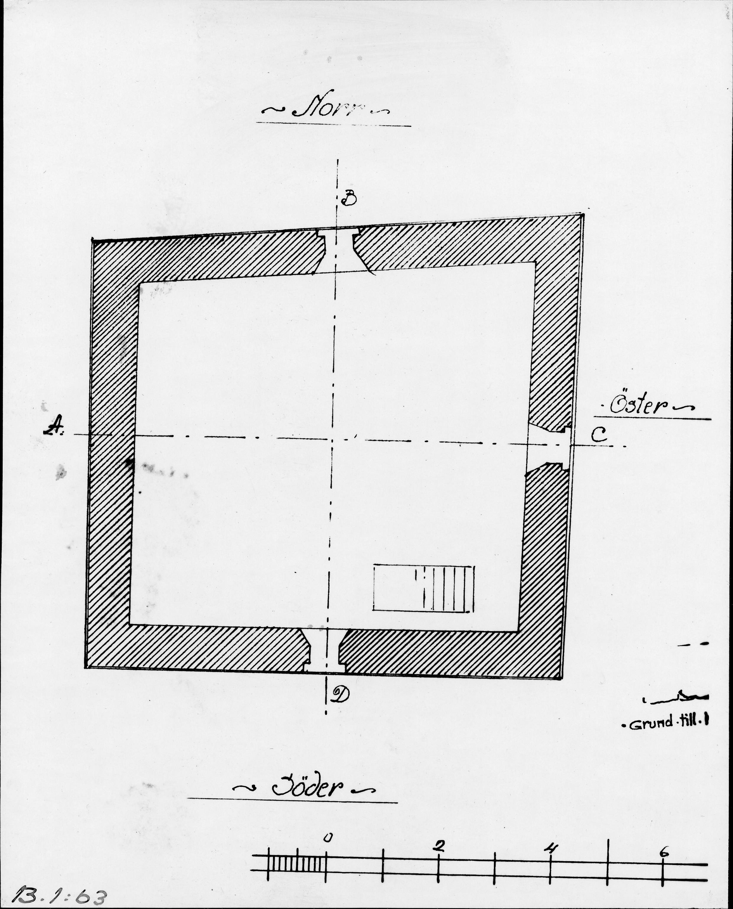 Beskrivning: Medeltida stenhuset (tiondeboden), plan. Uppmätning av Sigurd Curman. Avfotograferad.