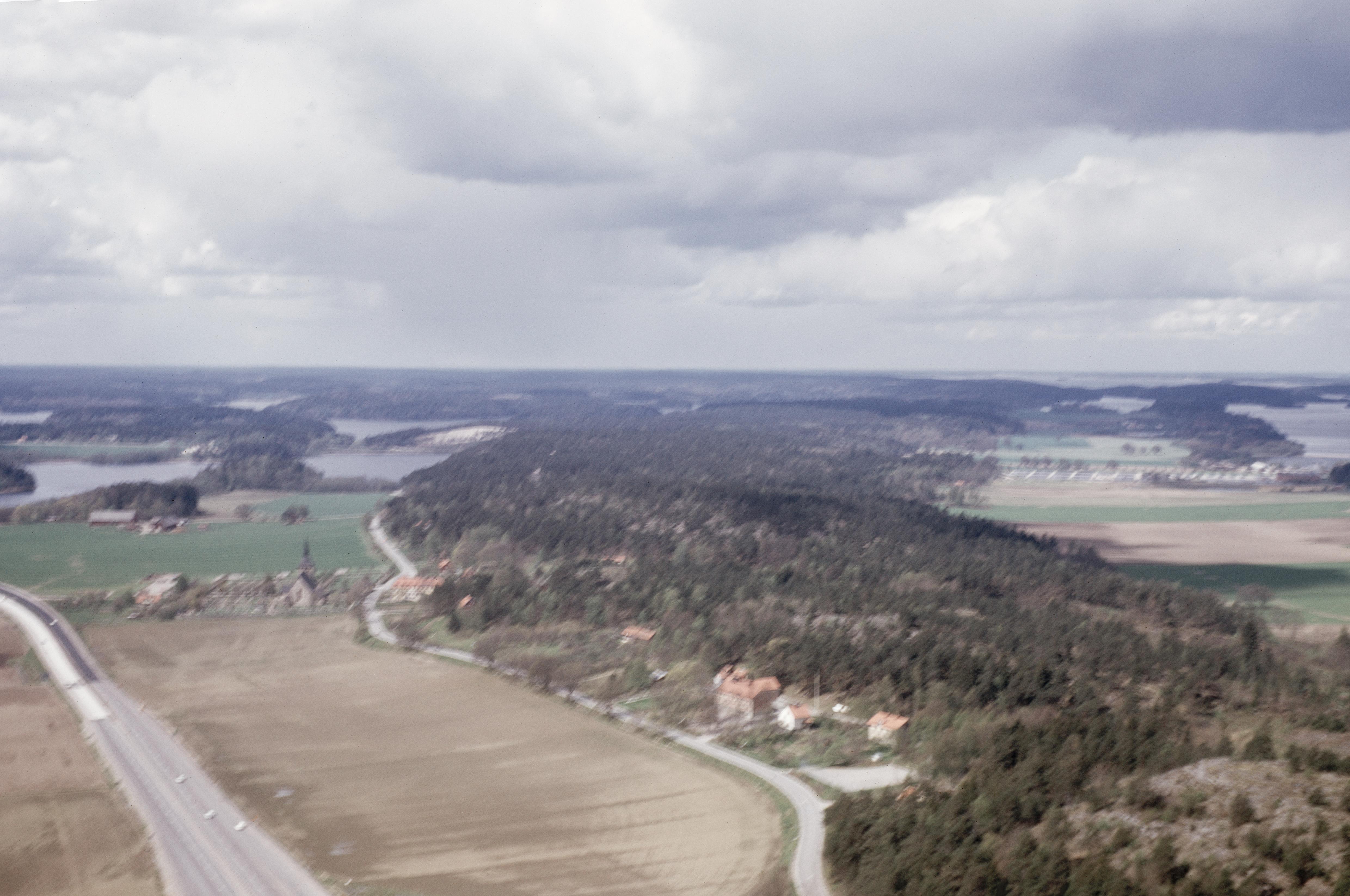 Beskrivning: Vägen "Gamla riks-1an". Till vänster Botkyrka kyrka och boplats RAÄnr Botkyrka 826:1 m.fl vid Eriksberg. Sjön Aspen i bildens övre del. Bilden är tagen mot (väderstreck): Ö (Obs! Bilden är oskarp).