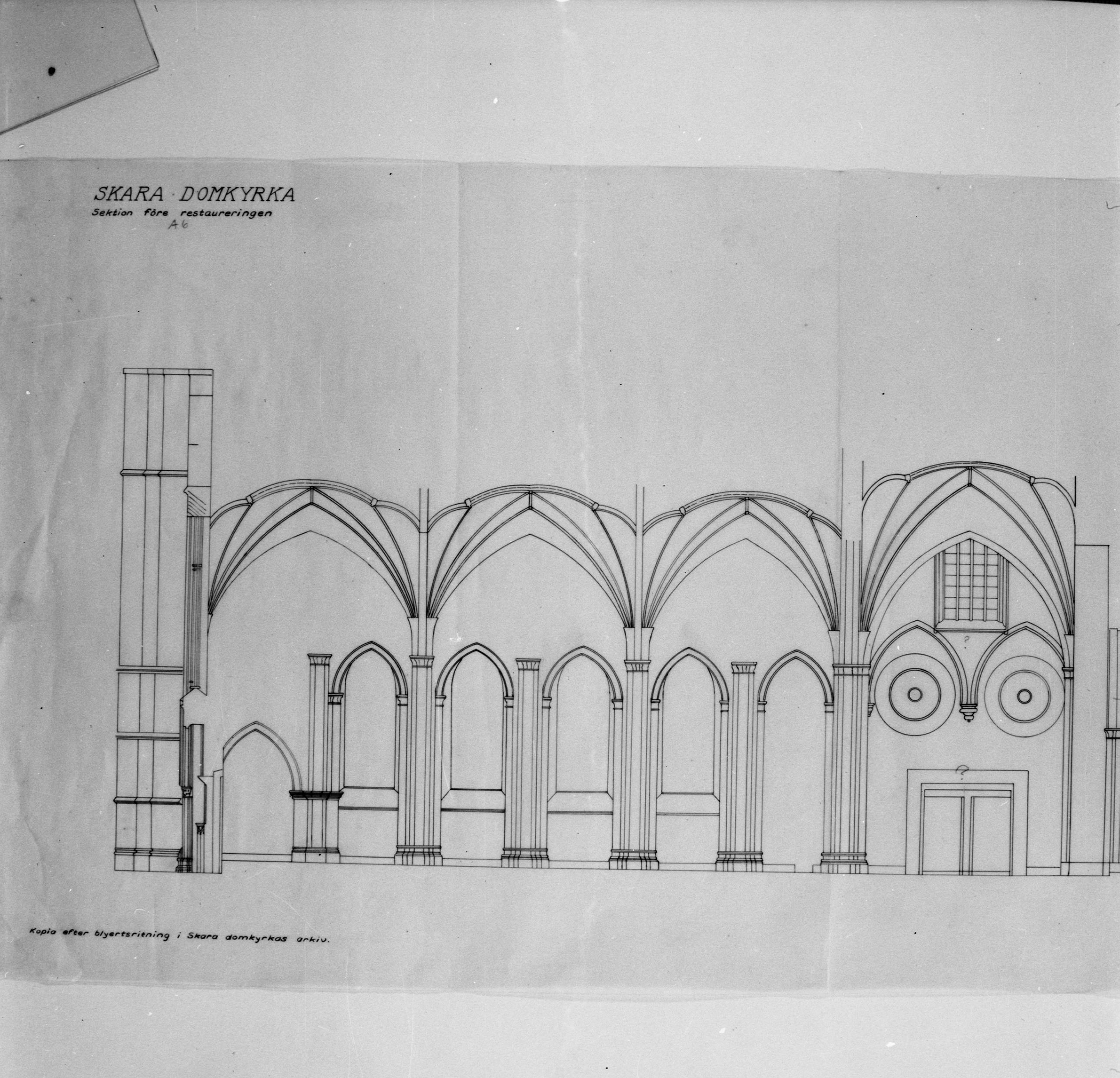 Beskrivning: Långhusets östra del, längdsektion. Foto efter ritning.