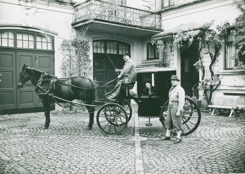 Fotografi föreställande enspännarkupé, förspänd med en häst som drar. Med kusk på kuskbocken och med passagerare. I kupén sitter Thyra Graaf (f. Ingelsson) och utanför står hennes make kommendörkapten Sixten Graaf.