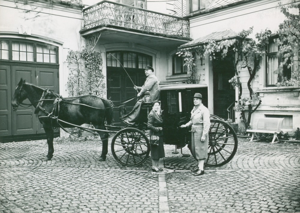 Fotografi föreställande enspännarkupé, förspänd med en häst som drar. Med kusk på kuskbocken och med passagerare. Utanför kupén står Thyra Graaf (f. Ingelsson) och hennes make kommendörkapten Sixten Graaf.