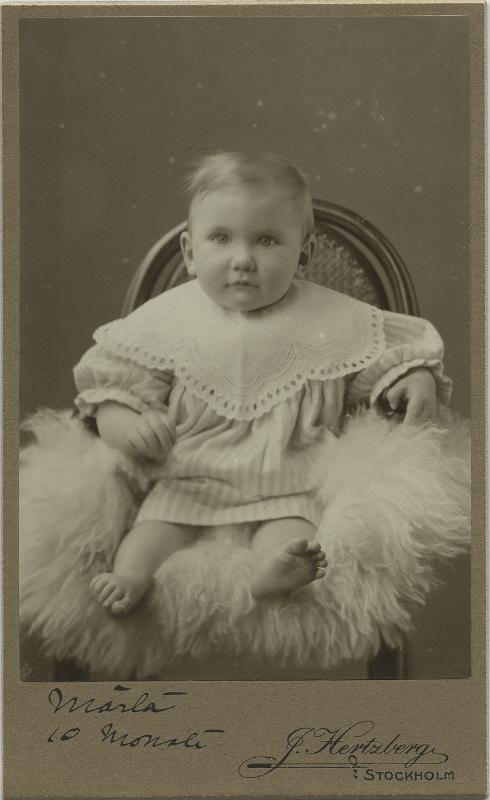 Fotografi som avbildar ett barn sittandes på en päls på en stol. Troligen anknuten till Elis Wadstein via familj eller vänner.