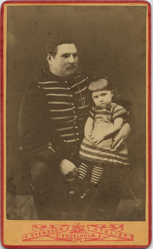 Fotografi som avbildar en man i militäruniform med ett flickbarn på knät. Troligen anknuten till Elis Wadstein via familj eller vänner.