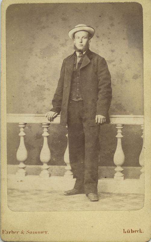Fotografi som avbildar en man i hatt, lutandes med sin hand på en balustrad. Troligen anknuten till Elis Wadstein via familj eller vänner.