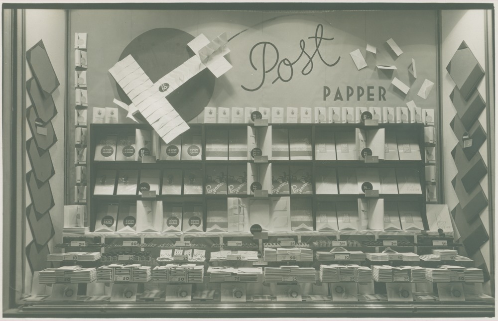 Fotografi ur album, föreställande skyltning i Epa-varuhuset i Helsingborg. Skyltning för kontorsartiklar och postprodukter, med text: "Post PAPPER".