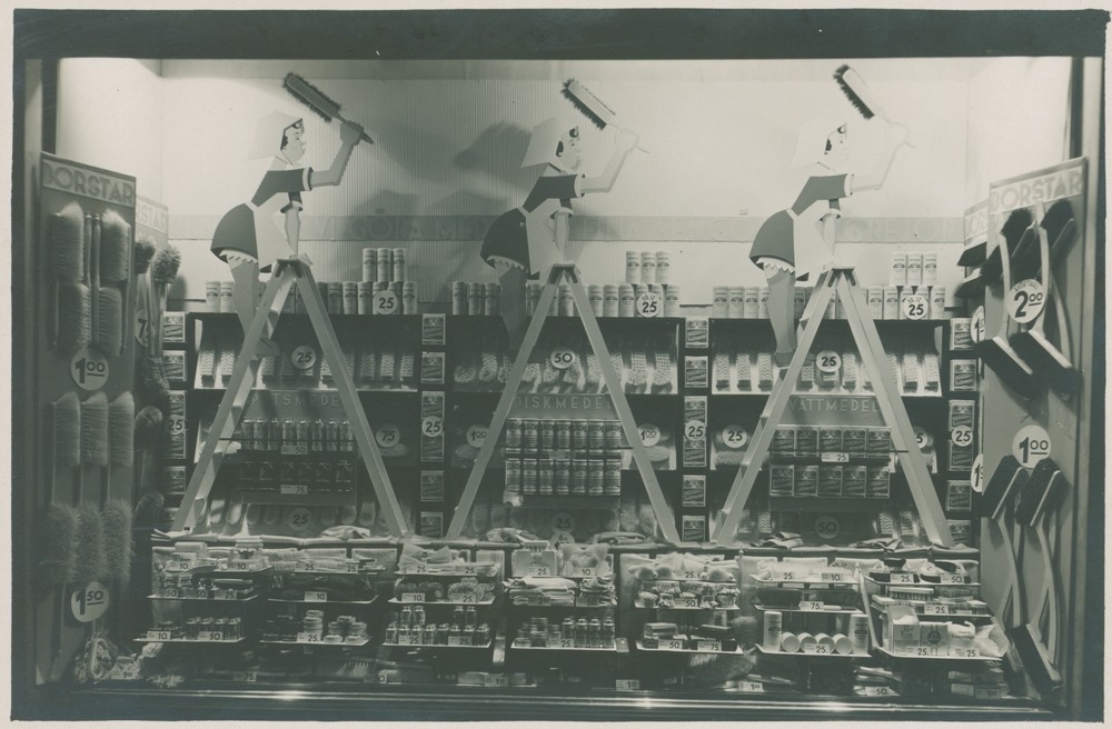 Fotografi ur album, föreställande skyltning i Epa-varuhuset i Helsingborg. Skyltning för städartiklar, fotograferad rakt framifrån.
