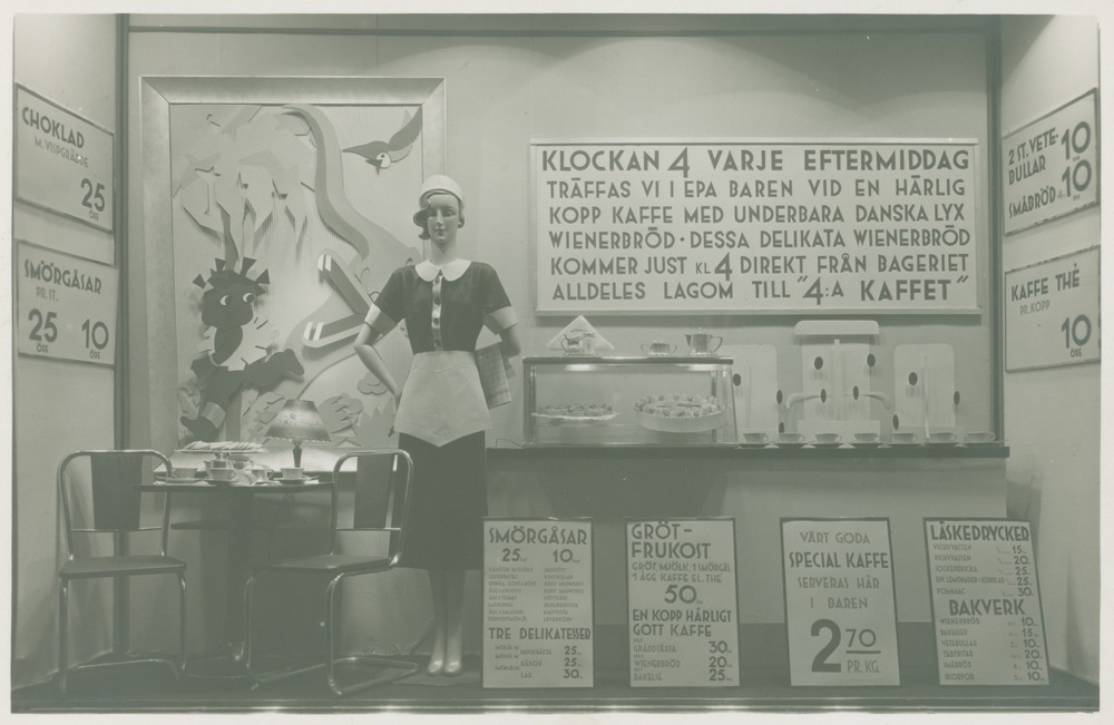 Fotografi ur album, föreställande skyltning i Epa-varuhuset i Helsingborg. Skyltning för Epas bar, med byggd caféinteriör och mycket text, t.ex. "Klockan 4 varje eftermiddag träffas vi i Epa baren vid en härlig kopp kaffe med underbara danska lyx wienerbröd. Dessa delikata wienerbröd kommer just kl 4 direkt från bageriet alldeles lagom till "4:a kaffet".