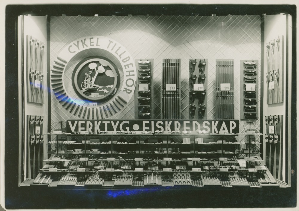 Fotografi ur album, föreställande skyltning i Epa-varuhuset i Helsingborg. Skyltning för verktyg, fiskeredskap och cykeltillbehör. En mängd produkter uppställda.