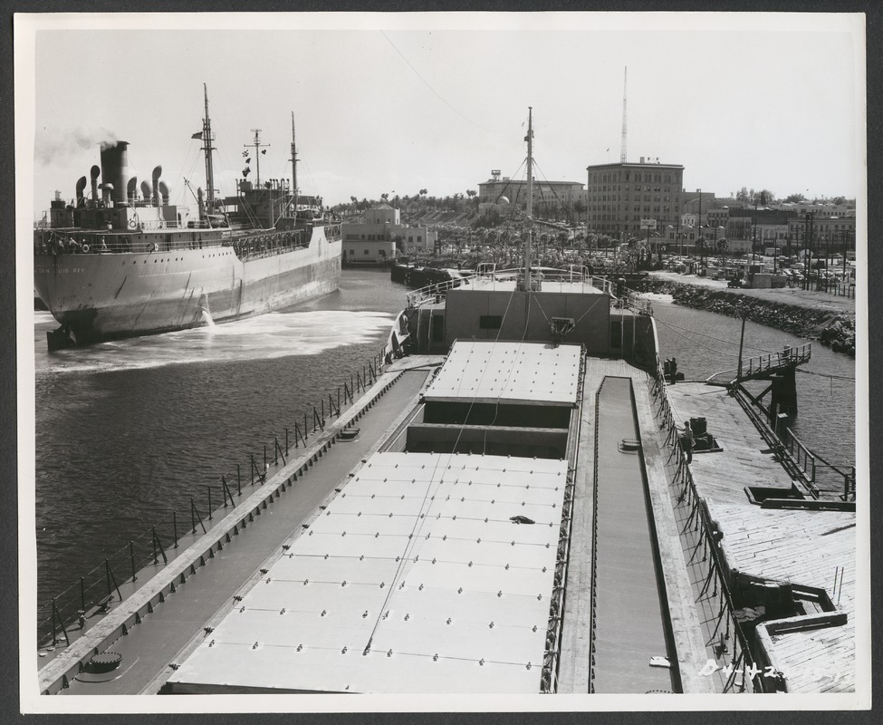 Bilden föreställer del av övre däck på fartyg. I bakgruden annat fartyg samt stadsbebyggelse