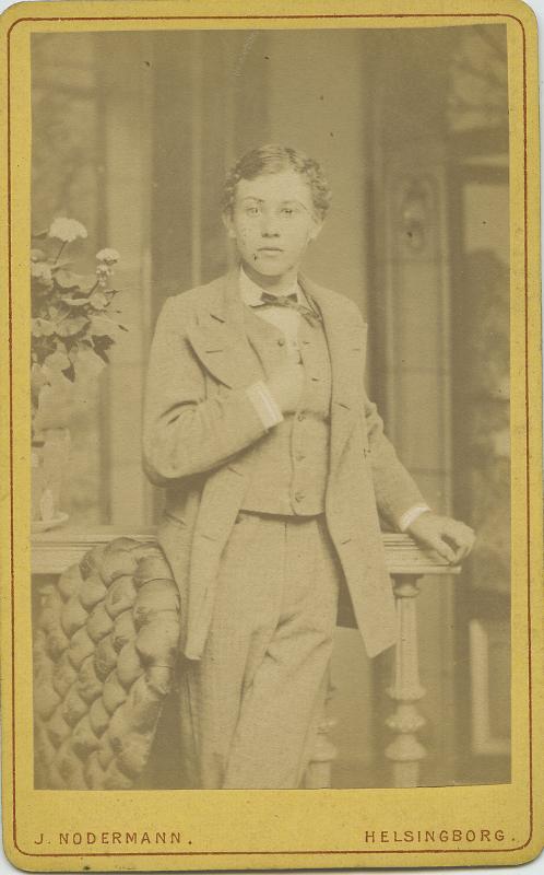 Fotografi som avbildar en ung man med en hand i skjortan och den andra handen vilandes på ett bord. Troligen anknuten till Elis Wadstein via familj eller vänner.
