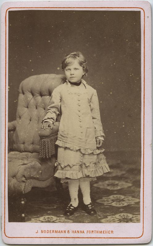 Fotografi som avbildar en flicka ståendes med handen på en fåtölj. Troligen anknuten till Elis Wadstein via familj eller vänner.