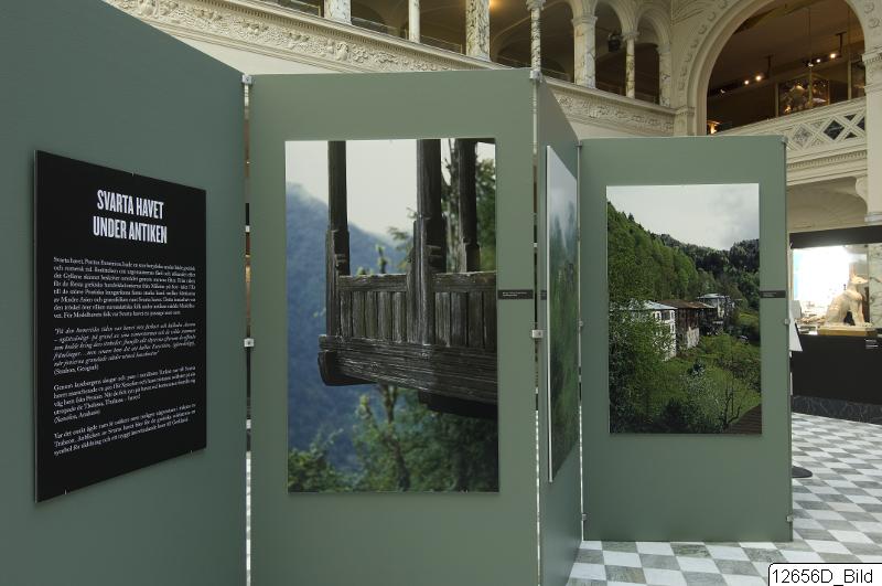 Medelhavsmuseet, Interiörer från utställningen ”Träarkitektur vid Svarta havet”. till höger skymtar egyptiska skulpturen MME 1990:008.