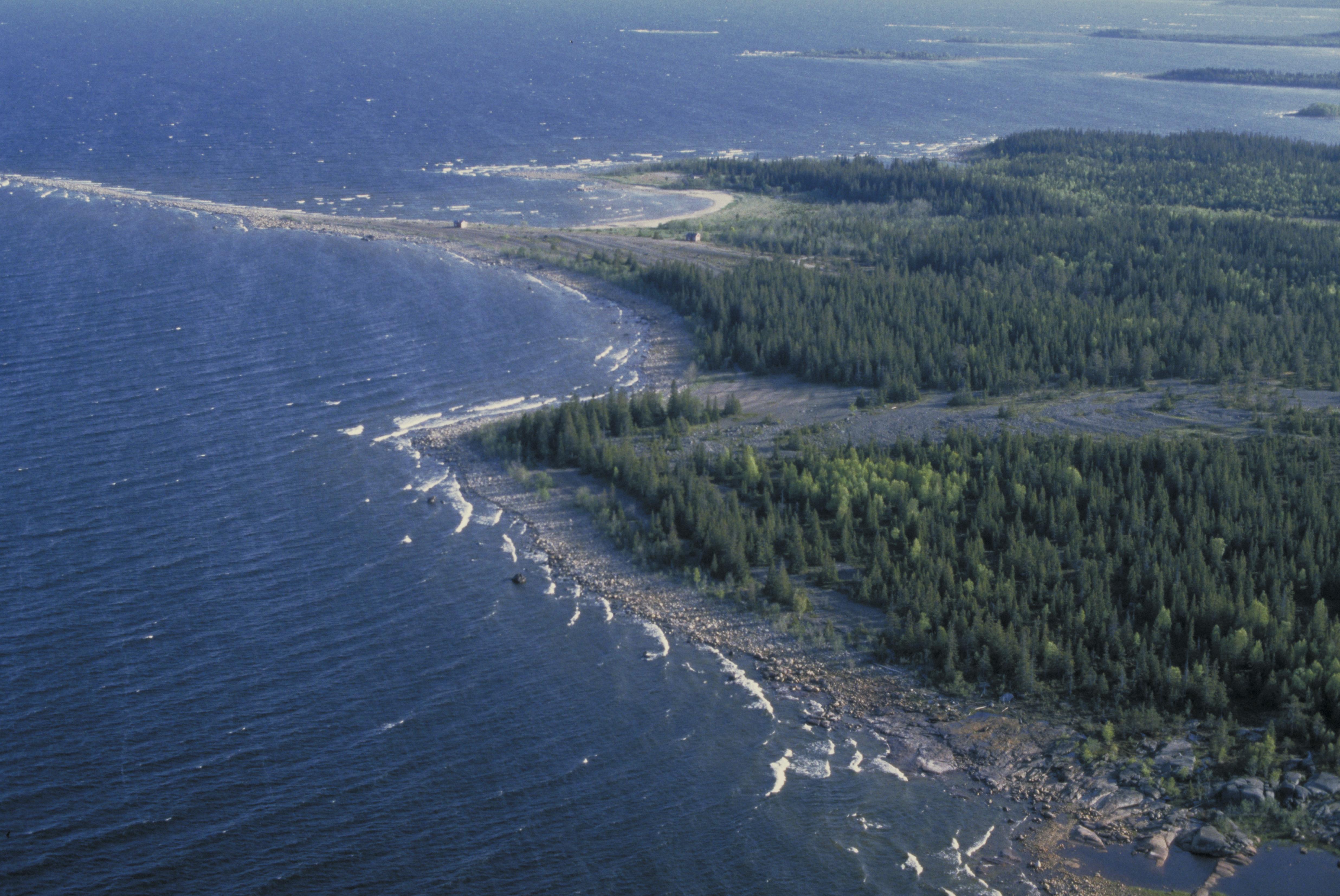 Fornlämningsområde RAÄnr Lövånger 78:1 med tomtningar (fiskeläge, labyrint, hyddbottnar) vid näset Grundskatan och Bjuröklubb på Bjurön. Bilden är tagen mot (väderstreck): S