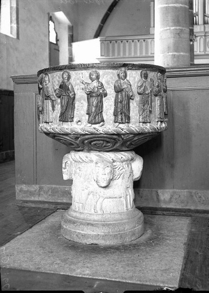 Beskrivning: Dopfunt av Mäster Calcarius, omkring 1200.