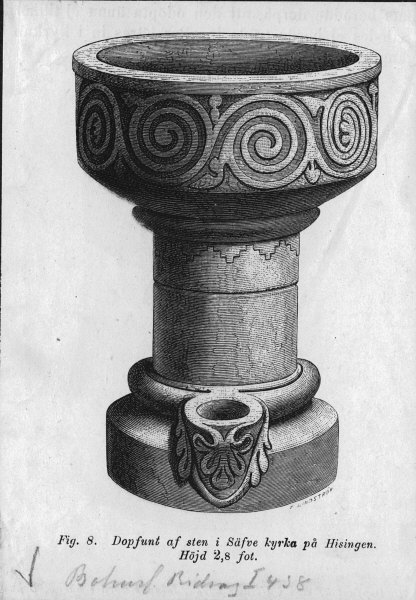 Beskrivning: Teckning av dopfunt av täljsten. Omkr. 1230-50. Av Thorbillus.