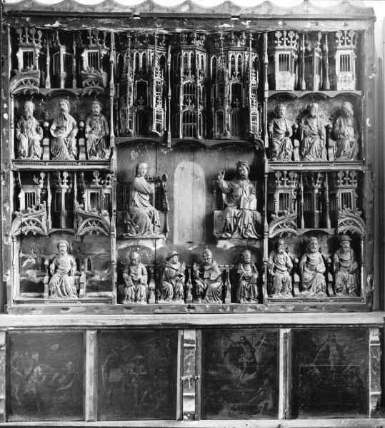 Beskrivning: Altarskåp av trä, dörrar och några figurer borta. Rik förgyllning från omkring 1400-talet. Troligtvis nordtyskt arbete.
