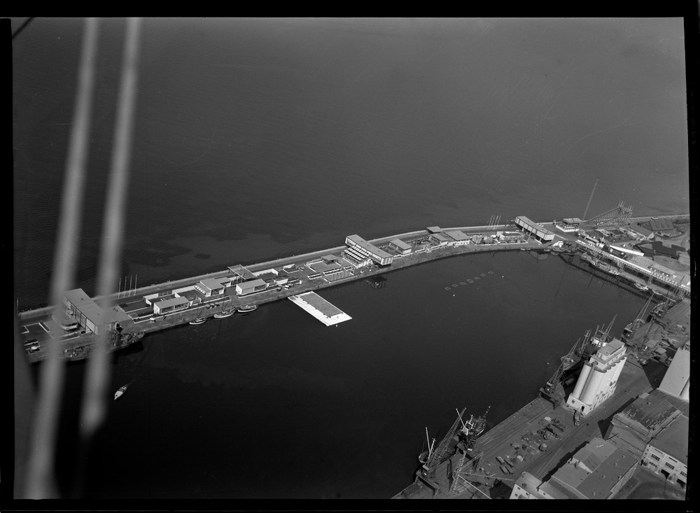 Bilden föreställer en flygbild över Parapeten och hamnen med sin bebyggelse.