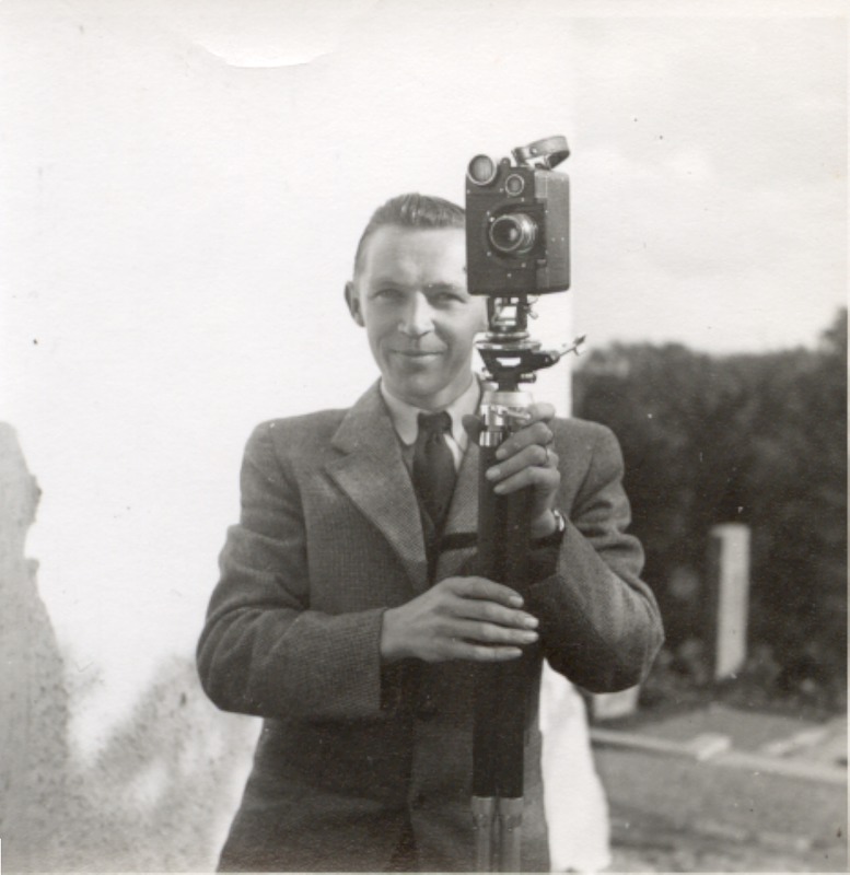 Fotografi som avbildar Gustav Pålsson hållandes en kamera på ett stativ.