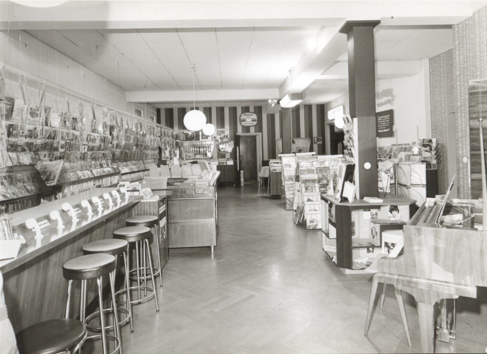 Fotografi som avbildar grammofon avdelningen på andra våningen av Hefoma affär på Järnvägsgatan 3. Tagen efter ombyggnaden av affären 1957-58, troligen på 60-talet.