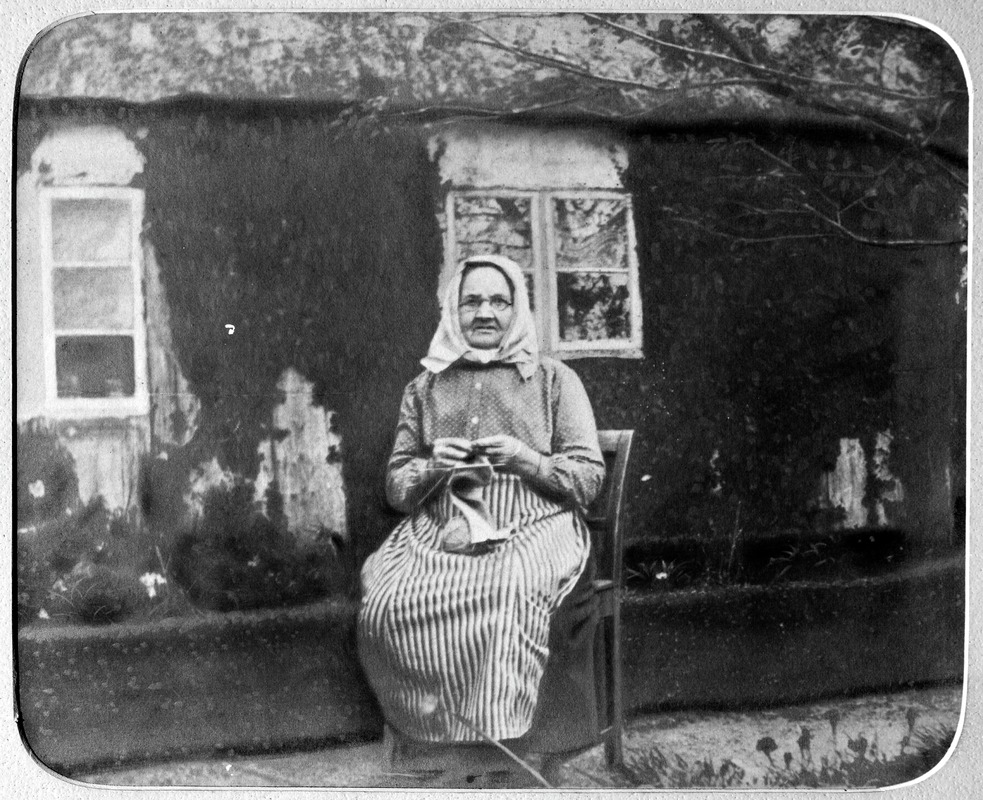 Fotografi som avbildar Beata Erlandsson som sitter framför sitt hus och stickar, tidigt 1900-tal. Troligen Fleninge 29 nära Hasslarpsån.
